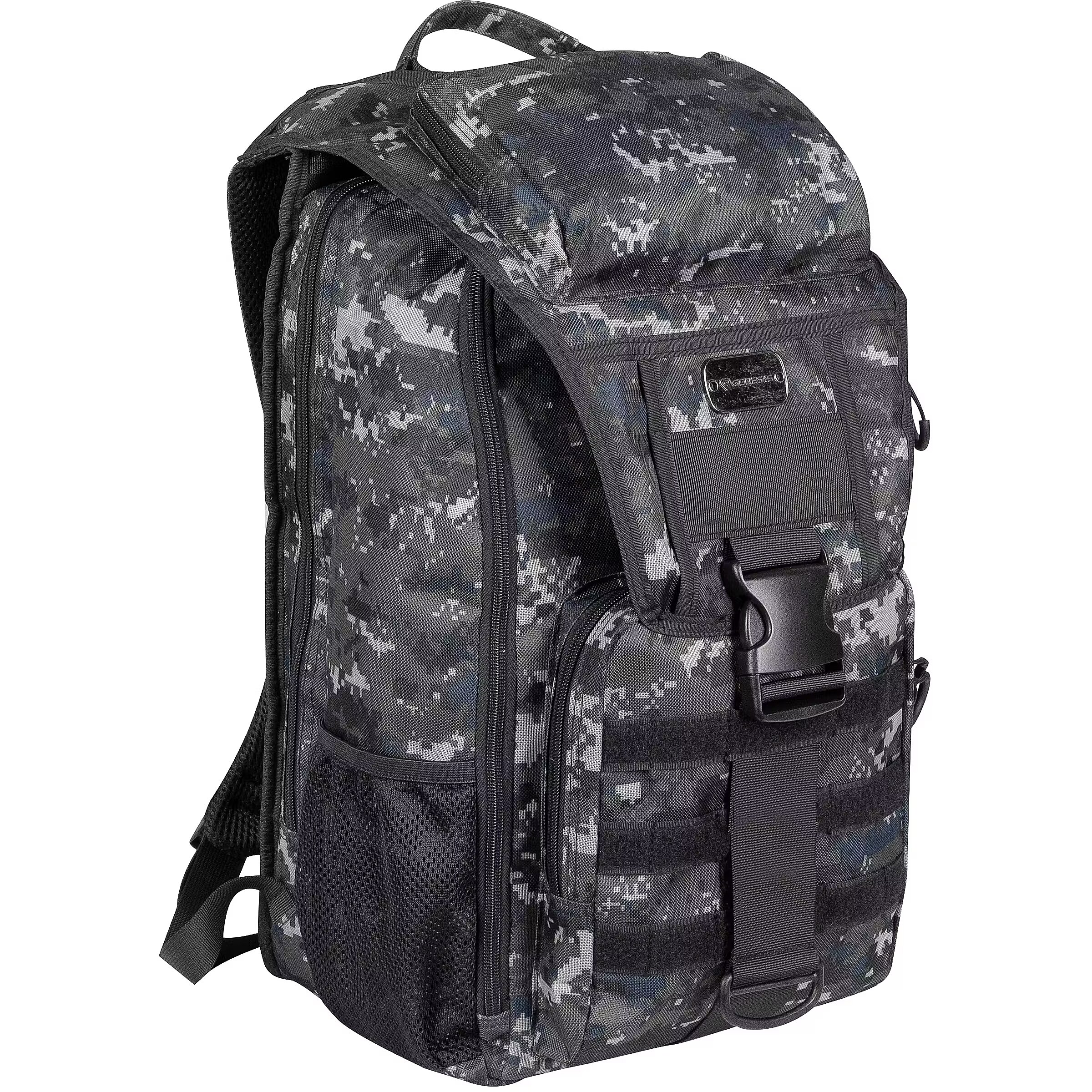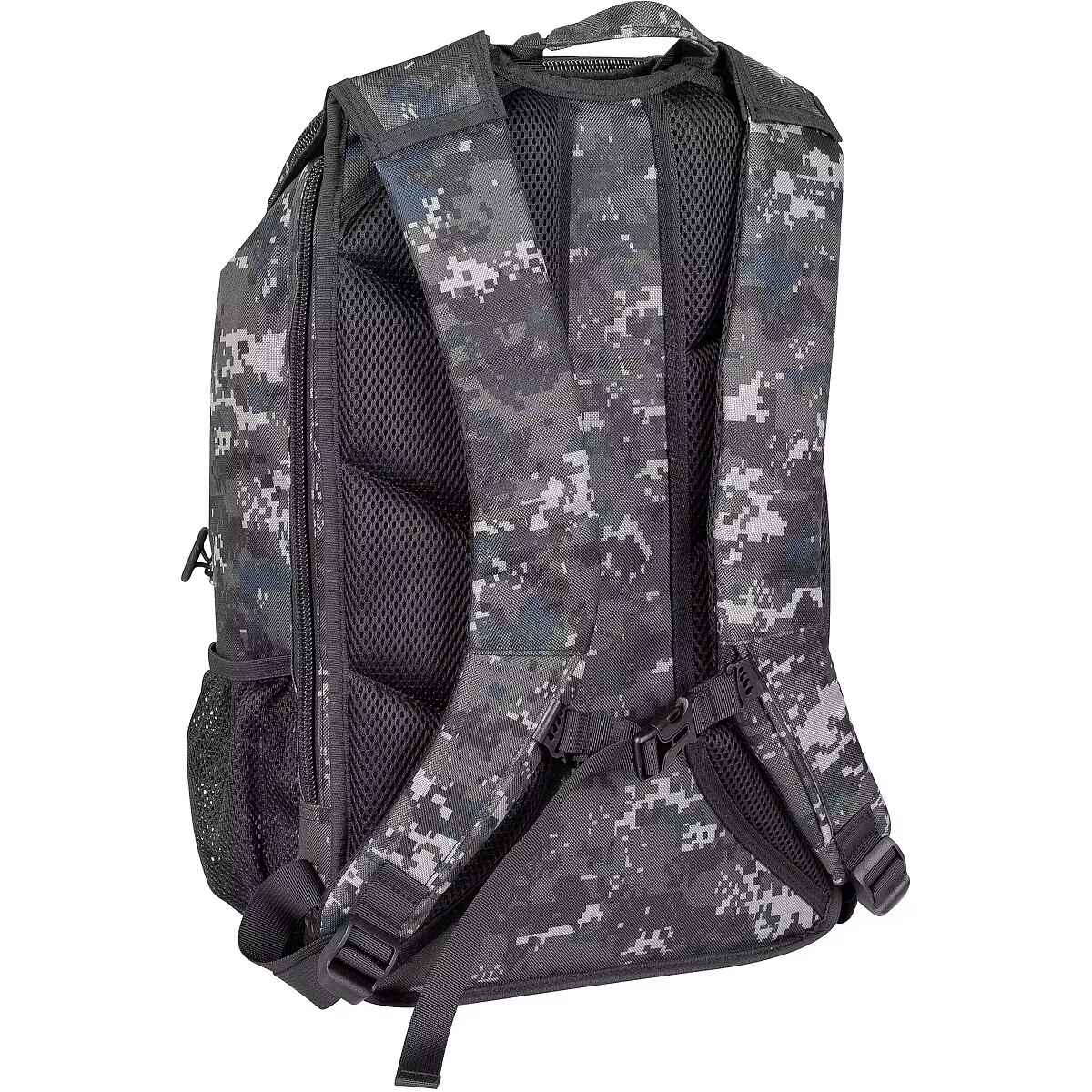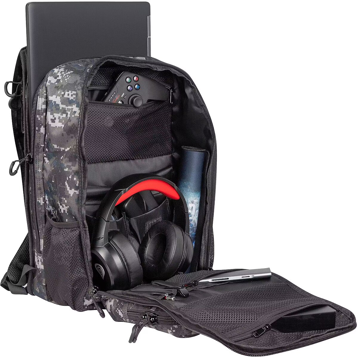 Spacious backpack in military design, which fits notebooks up to 15,6. Sturdy and durable construction with comfortable and roomy space for all gaming essentials. Made of durable fabric resistant to unfavorable weather conditions. Ergonomically formed back padding and shoulder straps with chest belt for optimal comfort. Laptop compartment equipped with a special pocket protecting the device from damaged and shock. Roomy main compartment with multiple easy-to-reach pockets for headset, mouse, powerbank and other peripherals. Front panel equipped with workstation for accessories. Two mesh side-pockets for beverage. Spacey front pocket. Molle-system and Velcro webbing placed on the front. Top-lid that buckles down over the front of the backpack with a pocket.