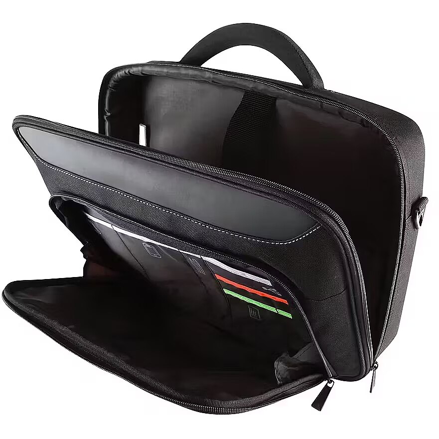 Technical details > Other features - * Designed to protect up to 14.1” W laptops with additional internal sleeve * Durable Polyester material with re-enforced rigid case* Multi-functional front zipped workstation for mobile phones, cables, earphones, business cards, and pens* Re-enforced adjustable padded handle for extra comfort * Velcro laptop security strap