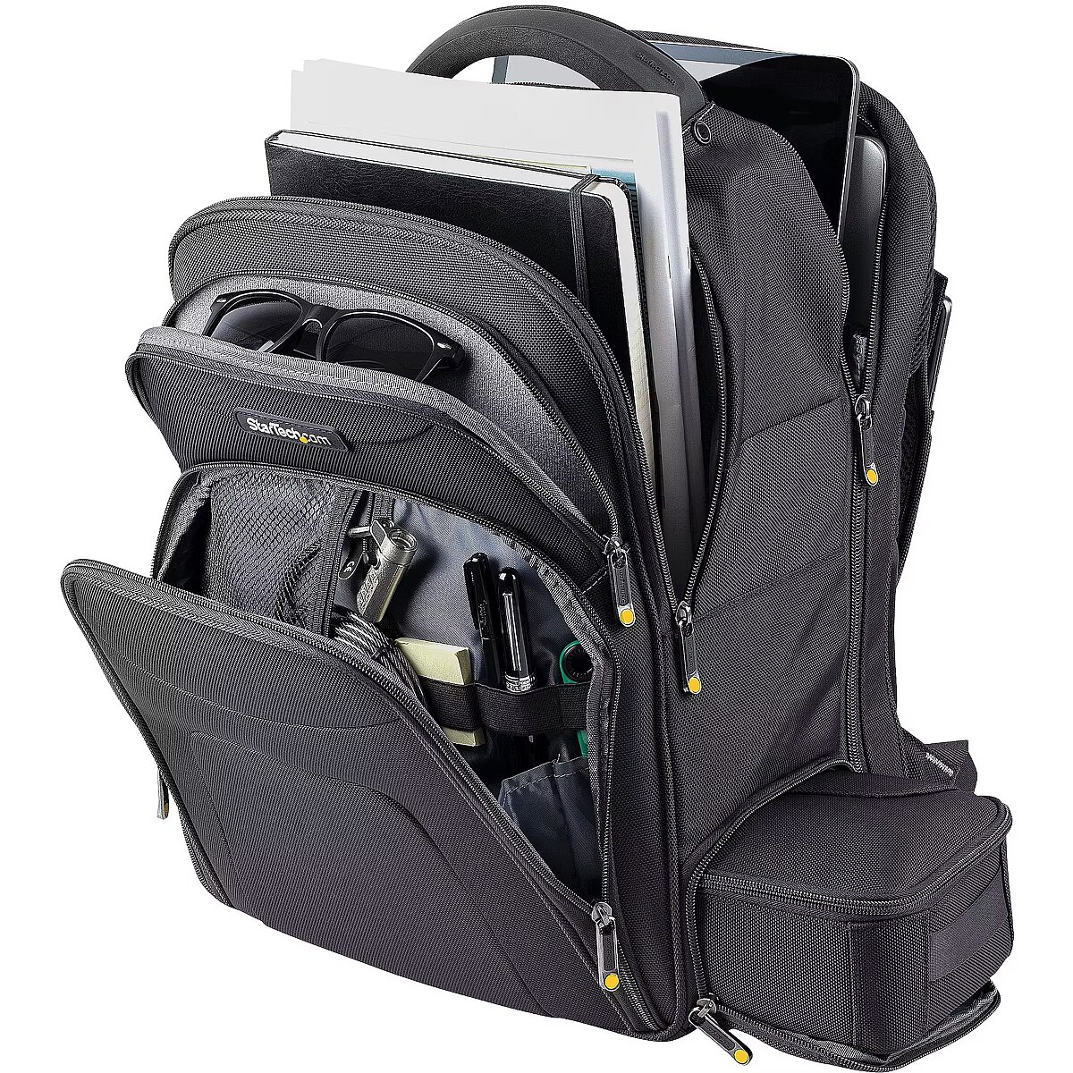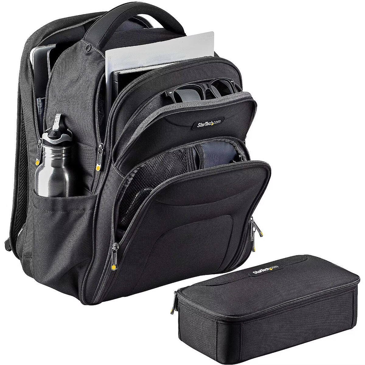 LongDesc - Professional IT Backpack for Work/Travel/Commute | Tablet Pocket & Laptop Sleeve | Removable Accessory Case15.6" Laptop BackpackThis laptop backpack is designed and built with IT Professionals & Technicians in mind. For short or long-distance commutes, this travel-friendly IT backpack can carry your 15.6" laptop and tablet with you wherever you go. Equipped with an accessories case that can be easily removed and fits all of your IT accessories, including your laptop charger, display adapters, wireless mouse, tools, measurement instruments, and more. The laptop bag and accessory case are constructed of heavy-duty ballistic nylon to keep your items secure.Removable Case for IT AccessoriesThe removable travel accessories pouch (10.5in x 5.25in x 3in) is stored in its own compartment and was designed to be easily accessed using the lower side pocket of the backpack to avoid searching through or displacing other items. The hook and loop dividers can be adjusted or removed to suit your needs, and the bungee grid is perfect for storing smaller IT accessories and cables. With the case removed, the main compartment can be expanded to offer more room for any other essentials required for a short or long-term trip.Ergonomic and Travel FriendlyThe computer bag features breathable ergonomic padding to help relieve strain and maximize comfort. It is designed for short distance (ie. daily commuting) and long-distance travel (ie. tradeshows and customer visits). The laptop bag features adjustable shoulder straps and a handle that is easy to grip. The laptop backpack meets most airline and TSA carry-on requirements and allows you to bundle your travel bags and rolling luggage using the integrated trolley sleeve.Thoughtful DesignThere are a variety of practical pockets, including a velvet-lined pocket to store sensitive items, a pocket for water bottles, and a pocket on the shoulder strap (to keep your phone, passport, or work badge easily accessible), among others.This notebook backpack is backed by a StarTech.com limited lifetime warranty, and free lifetime technical support.The StarTech.com Advantage