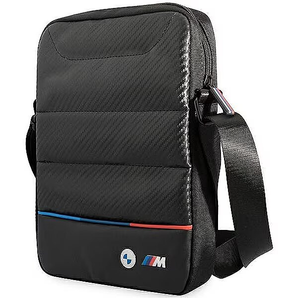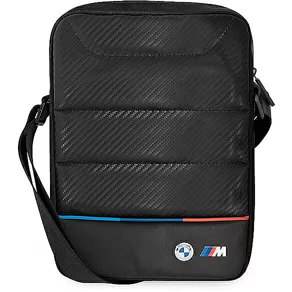 Description - BMW Carbon Tricolour Carbon tablet bag with BMW M Sport logo. Extremely high-quality materials and workmanship provided by BMW. Strap for easy carrying, spacious compartments so you have plenty of space for your tablet and accessories. A bag made of soft fabric that protects your device. Rear zip pocket ideal for storing your phone and small accessories. Product manufactured under license from BMW.