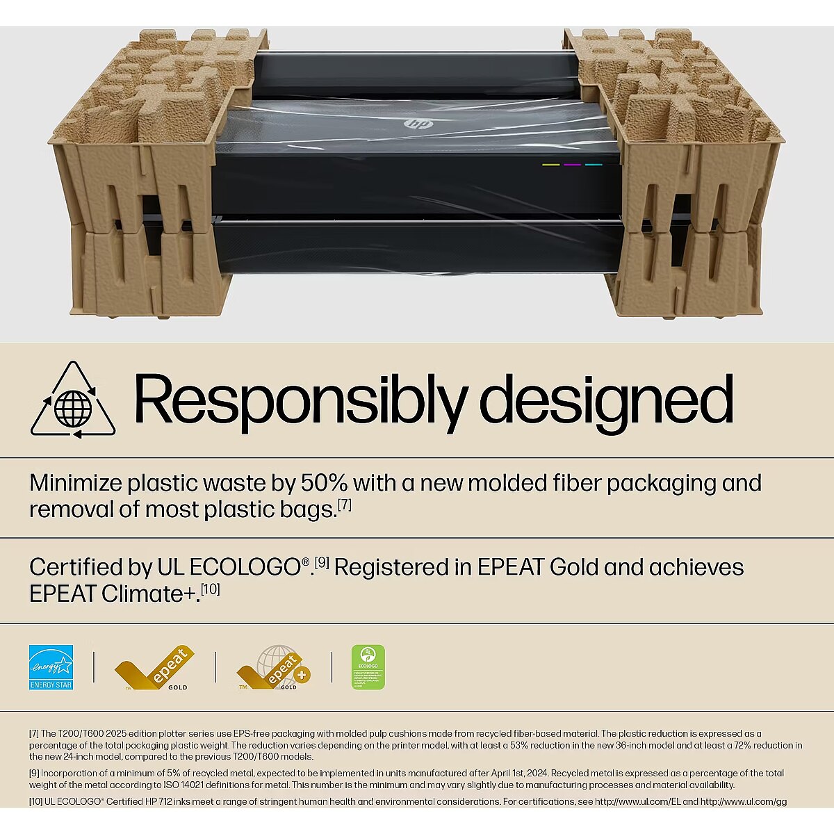 LongDesc - Focus on the project, not your plotter. This printer delivers incredible ease of use with HP Click Print solutions.[2] It's responsibly designed to help you save energy[5] and reduce plastics use[7]. Plus, it’s compact and adaptable—to fit the way you work.Dynamic security enabled printer Certain HP printers are intended to work only with cartridges that have a new or reused HP chip or electronic circuitry. These printers use dynamic security measures to block cartridges using a non-HP chip or electronic circuitry. Periodic firmware updates will maintain the effectiveness of these measures and block cartridges that previously worked. Reused HP chips and electronic circuitry enable the use of reused, remanufactured, and refilled cartridges.