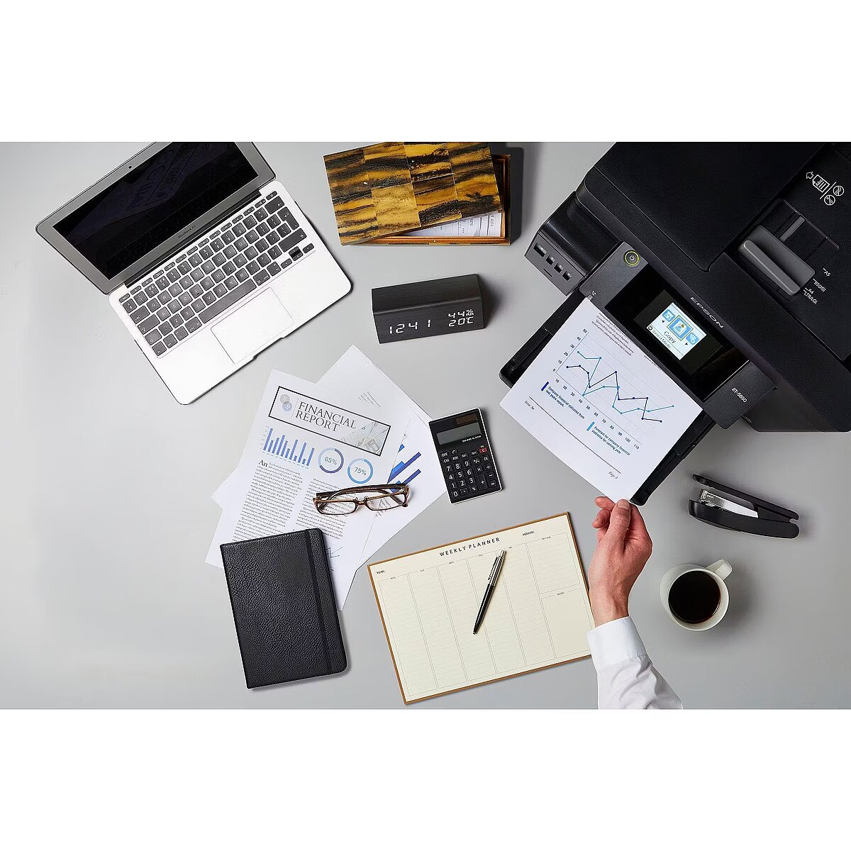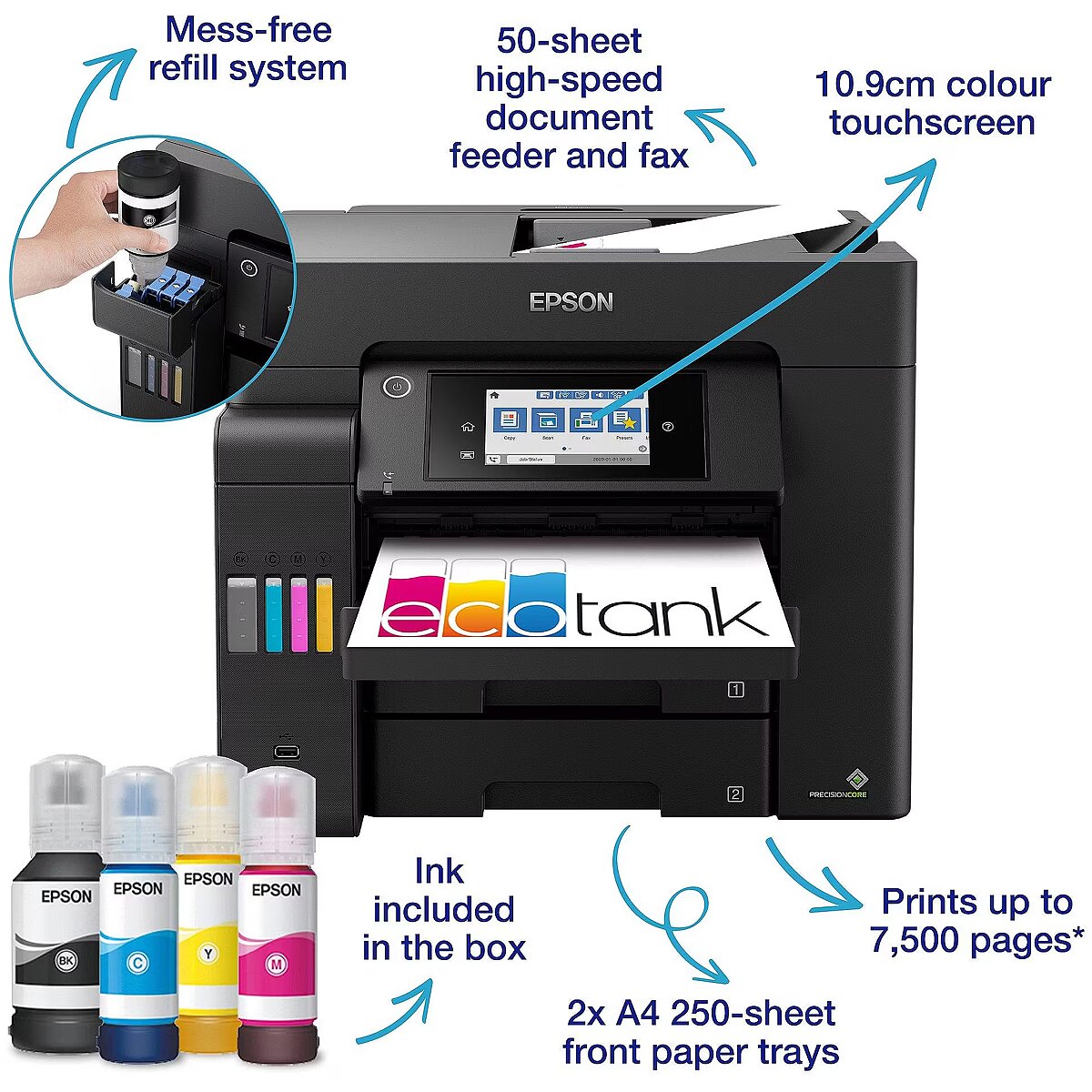 LongDesc - Get more done in less timeGet the edge with this fast and efficient printer that can deliver a first page in as little as 5½ seconds*. Coupled with fast double-sided printing, and a high speed Automatic Document Feeder, you’ll be able to speed through everyday tasks.Feature-rich A4 EcoTankThe ET-5805 is designed for office tasks with A4 print, scan, copy and fax. Selecting features is easy with the LCD touchscreen.Keep on savingSave every time you print with this EcoTank that delivers an incredibly low cost per page. Unlike other printers, EcoTank features large ink tanks that you fill with low-cost ink bottles.End interuptionsMinimising refills, this EcoTank can print thousands of pages before needing more ink, while the two front paper trays offer a capacity of 500-sheets. Free yourself from manual page loading with a generous 50-sheet rear feed and A4 ADF.Print from almost anywhereWith Wi-Fi and Wi-Fi Direct, you can send documents to print from smart devices using the Epson Smart Panel app*. Also features Ethernet.Easy to use and reliableFilling the large front ink tanks is simple with the resealable, intuitive and drip-free ink bottles. The Heat-Free PrecisionCore printhead is renowned for its speed, quality, reliability and efficiency, and will last the lifetime of the printer.