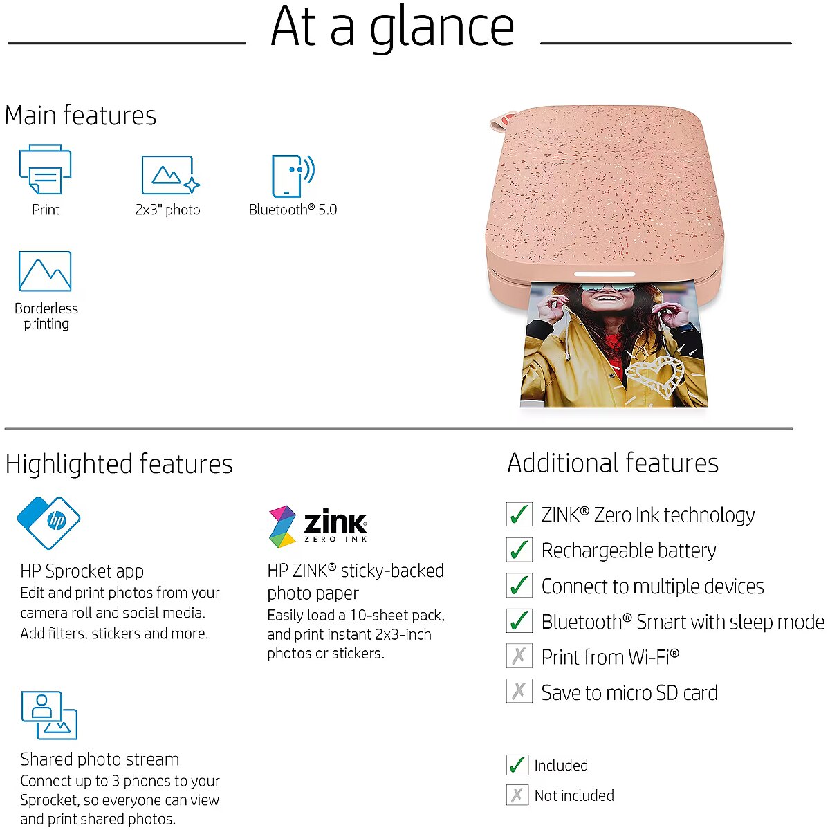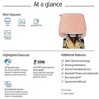 LongDesc - Share the present with instant 5 x 7.6 cm (2 x 3 in) photos from your smartphone. Easily connect smartphones to your Sprocket so everyone can print and view shared photos from your event.[1] Relive every fun-filled moment with an amazing app.[2]