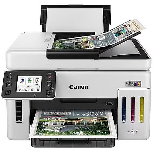 Description - Canon MAXIFY GX6140 Wykorzystaj możliwości wydajnego drukowania biznesowego drukarki MegaTank dzięki pojemnym, umożliwiającym uzupełnianie atramentu zbiornikom. Możesz liczyć na wydruki o jakości biznesowej i wyjątkowo niski całkowity koszt posiadania. MAŁE DECYZJE, MAKSYMALNY EFEKT Dzięki tym niezawodnym drukarkom MegaTank umożliwiającym drukowanie w dużych nakładach i uzupełnianie zbiorników na atrament szybko wydrukujesz dokumenty klasy biznesowej, osiągając średnie oszczędności na całkowitym koszcie posiadania4 na poziomie 90% w porównaniu z możliwościami 10 najlepszych drukarek laserowych i atramentowych. DOSKONAŁA PRACA W KAŻDYM ŚRODOWISKU Właściciele firm, którym zależy na tanim drukowaniu w dużych nakładach, docenią możliwości modelu MAXIFY GX6140. Biura nieruchomości Automatyczny podajnik dokumentów na 50 arkuszy pozwala szybko tworzyć oferty nieruchomości dla klientów oraz skanować i kopiować kluczowe dokumenty bez obaw o brak atramentu lub papieru. Drukuj wizytówki na papierze matowym lub błyszczącym. Handel detaliczny Drukuj faktury bez wysiłku dzięki stałej niezawodności, dużej szybkości i niewielkim wymiarom urządzenia. Twórz wysokiej jakości, trwałe materiały do punktów sprzedaży, banery promocyjne i etykiety wszystko we własnym zakresie. Prywatne kliniki Drukuj dokumentację klientów i informacje o nowych wizytach, a nawet dane bezpośrednio na kopertach. Stwórz ciekawe materiały promocyjne, które wypromują możliwości Twojej kliniki. Instytucje edukacyjne Twórz materiały szkoleniowe, materiały do prezentacji oraz dokumenty administracyjne każdego dnia, korzystając z oszczędnej drukarki. Niezmiennie niskie koszty Obniż koszty druku biznesowego dzięki ogromnej wydajności 14 0001 stron z zestawu butelek z kolorowym atramentem lub 60001 stron z butelki z czarnym atramentem. Aby uzyskać jeszcze większe oszczędności, przełącz się na tryb ekonomiczny. Trwałe dokumenty błyskawiczne drukowanie Drukuj wyróżniające się dokumenty biznesowe z jaskrawymi kolorami i niezwykle wyraźnymi szczegółami nawet z tak drobnymi detalami jak kody kreskowe i kody QR w tempie przekraczającym 24 obr./min w czerni oraz 15,5 obr./min w kolorze. Z łatwością możesz zarządzać obiegiem dokumentów za pomocą specjalnych funkcji biznesowych. Niewielki rozmiar, duże możliwości Pilne zlecenia nie będą problemem dzięki podajnikowi dokumentów na 50 arkuszy, odchylanemu kolorowemu ekranowi dotykowemu o przekątnej 6,9 cm oraz zasobnikowi papieru o pojemności 350 arkuszy. Obsługa różnorodnych nośników - możliwość drukowania banerów o długości do 1,2 m. Maksymalna wydajność Oszczędzaj energię dzięki wydajnemu drukowaniu atramentowemu przy użyciu bardzo wydajnych butelek z atramentem oraz funkcji skanowania do folderów sieciowych, poczty e-mail lub pamięci USB. Wymieniana przez użytkownika kaseta konserwacyjna minimalizuje czas przestojów. Bądź w kontakcie Aplikacja Canon PRINT umożliwia drukowanie, skanowanie i kopiowanie oraz łączenie się z chmurą. Zgodność z usługami Apple AirPrint (iOS) i Mopria (Android). Wykorzystaj łączność Ethernet i obsługę dwuzakresowej sieci Wi-Fi. Bezpieczeństwo i ochrona Korzystaj z wielopoziomowej ochrony dzięki zabezpieczeniom Wi-Fi WPA3, obsłudze szyfrowania TLS1.3 umożliwiającej bezpieczną wymianę danych oraz automatycznym aktualizacjom oprogramowania sprzętowego przeciwdziałającym najnowszym zagrożeniom.