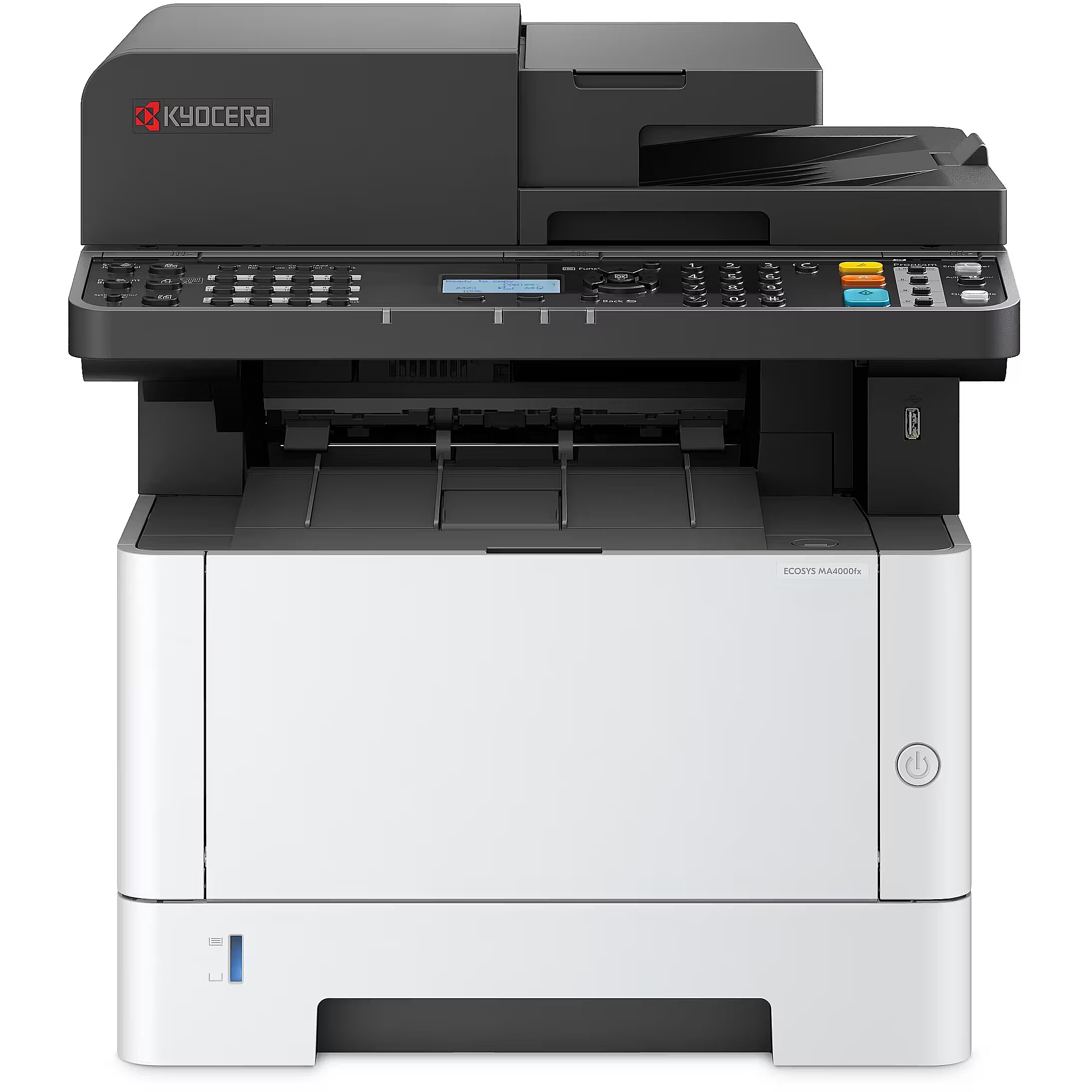 LongSummaryDescription - KYOCERA ECOSYS MA4000fx. Print technology: Laser, Printing: Mono printing, Maximum resolution: 1200 x 1200 DPI. Copying: Mono copying, Maximum copy resolution: 600 x 600 DPI. Scanning: Colour scanning, Optical scanning resolution: 600 x 600 DPI. Faxing: Mono faxing. Duplex functions: Copy, Fax, Print, Scan. Maximum ISO A-series paper size: A4. Direct printing. Product colour: Black, White