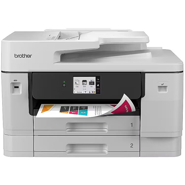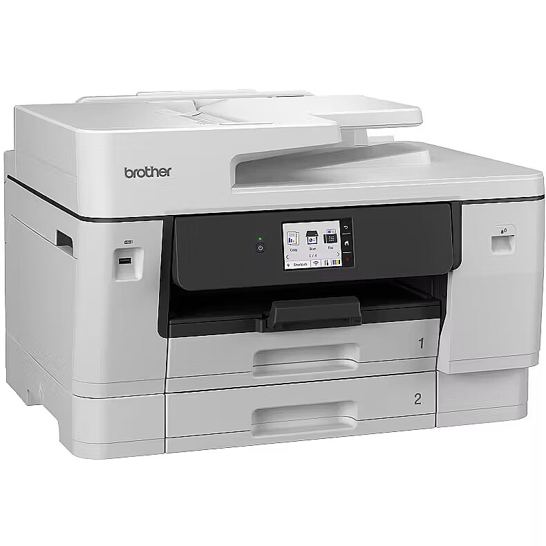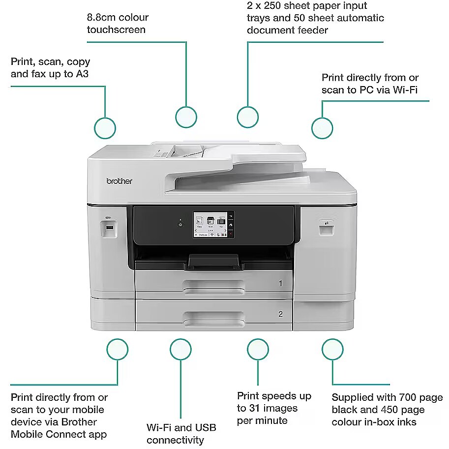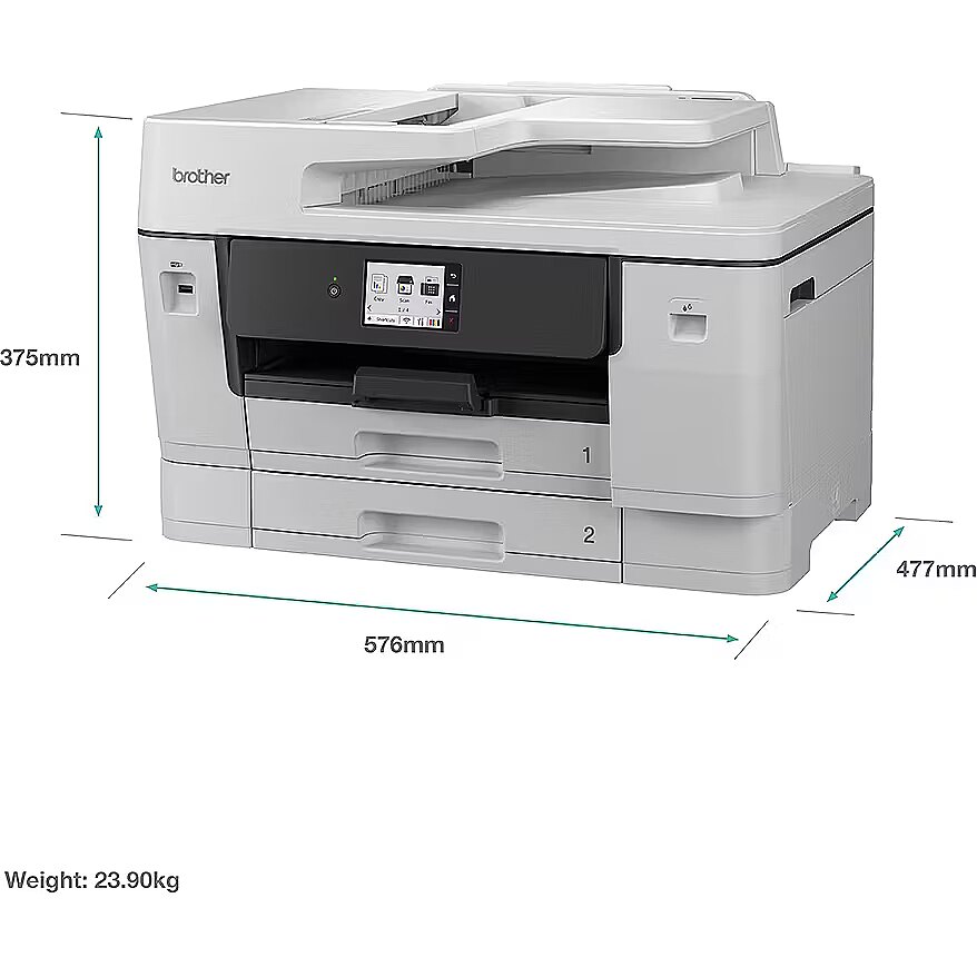 LongDesc - The MFC-J6960DW delivers premium A3 printing, scanning, copying and faxing in one durable inkjet device. Featuring MAXIDRIVE technology, offering fast print speeds and consistently high-quality results. Enjoy flexible paper handling with 2 x 250 sheet paper input trays, 100 sheet multi-purpose tray and 50 sheet automatic document feeder (ADF).Reliability with MAXIDRIVEBrother's patented MAXIDRIVE print chip features advanced piezoelectric technology that ejects ink at high power allowing for faster printing with precision ink delivery. The automatic maintenance, durable components and premium pigment inks consistently produce vibrant colours and crisp, sharp text from your first page to your last.Effortless setup and useTake control with driverless printing for a quick and effortless setup. Flexible connectivity options include Gigabit Ethernet, 5GHz Wi-Fi and USB enabling fast and hassle free use.Connect for more controlSet up, print and scan on the go with the Brother Mobile Connect app. Control all your Brother printers from the palm of your hand. Easily check ink levels, order and save on genuine Brother supplies, access your scanned documents history and personalise your frequently used features.