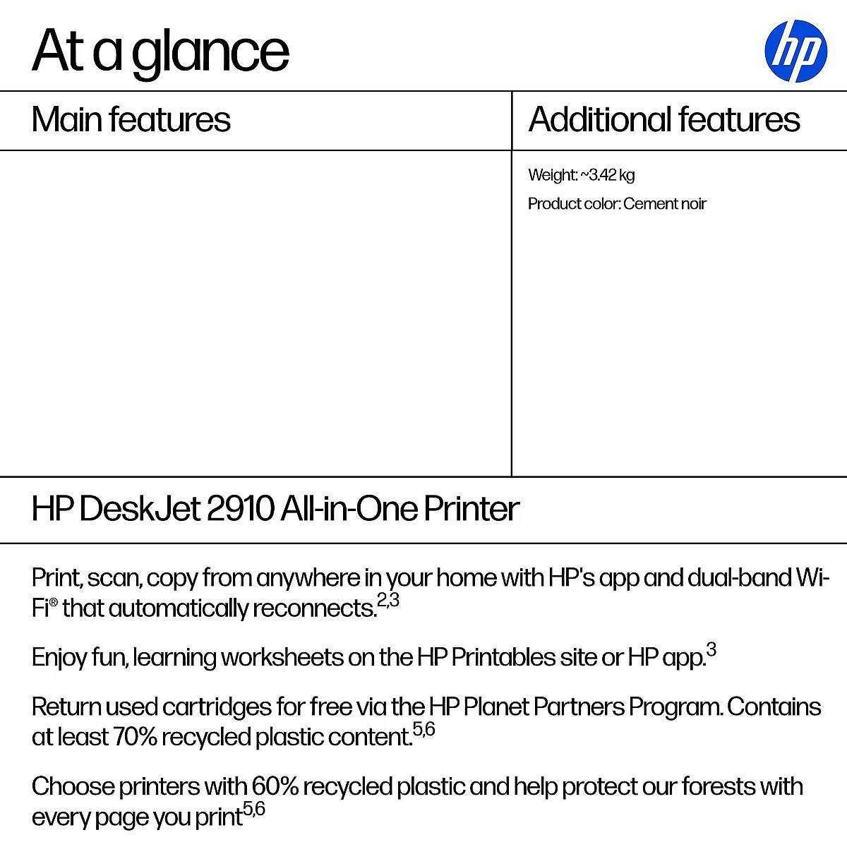 Technical details - Box contents - HP DeskJet 2910 All-in-One Printer; HP 308 Setup Black Cartridge; HP 308 Setup Tri-Color Cartridge; Regulatory flyer; Setup guide; Reference guide; Power cord [For ink volume and page yield information, visit http://hp.com/go/learnaboutsupplies]
