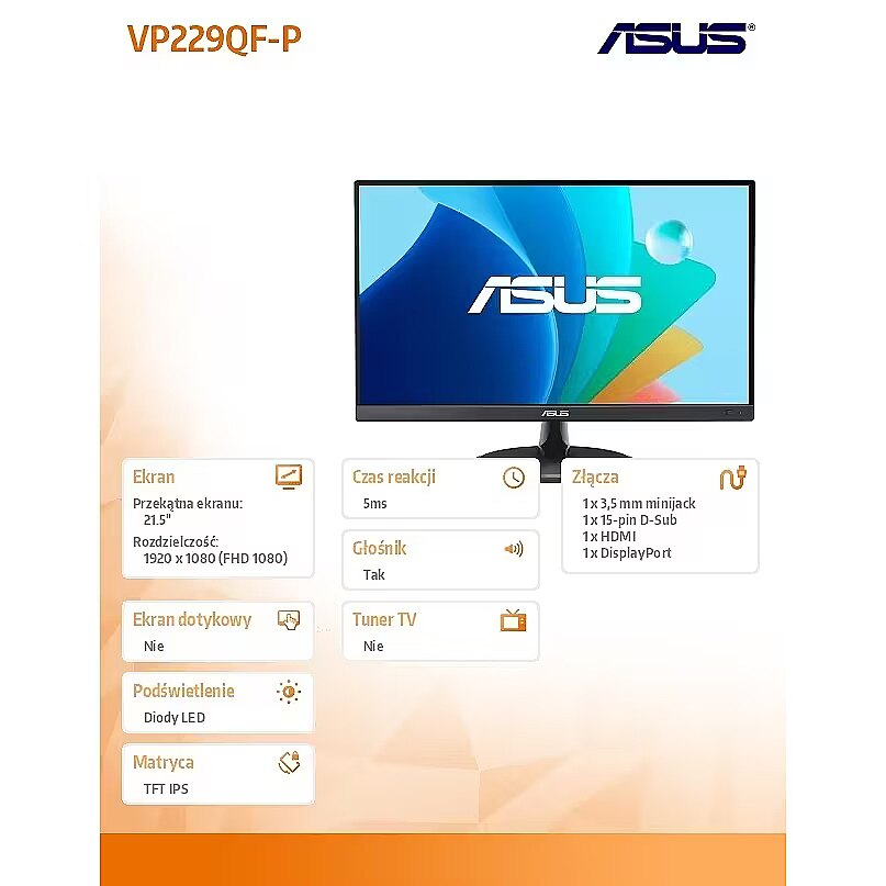 Tämä Asus VP229QF-P, 21.5" -näyttö, jonka resoluutio on FHD 1920x1080, soveltuu mukavasti työskentelyyn dokumenttien, verkkosisällön ja multimedian kanssa. Se tarjoaa luonnollisen kuvan toiston, miellyttävän katselukokemuksen ja vakaan suorituskyvyn, täyttäen käyttäjän tarpeet universaalille työnäytölle.