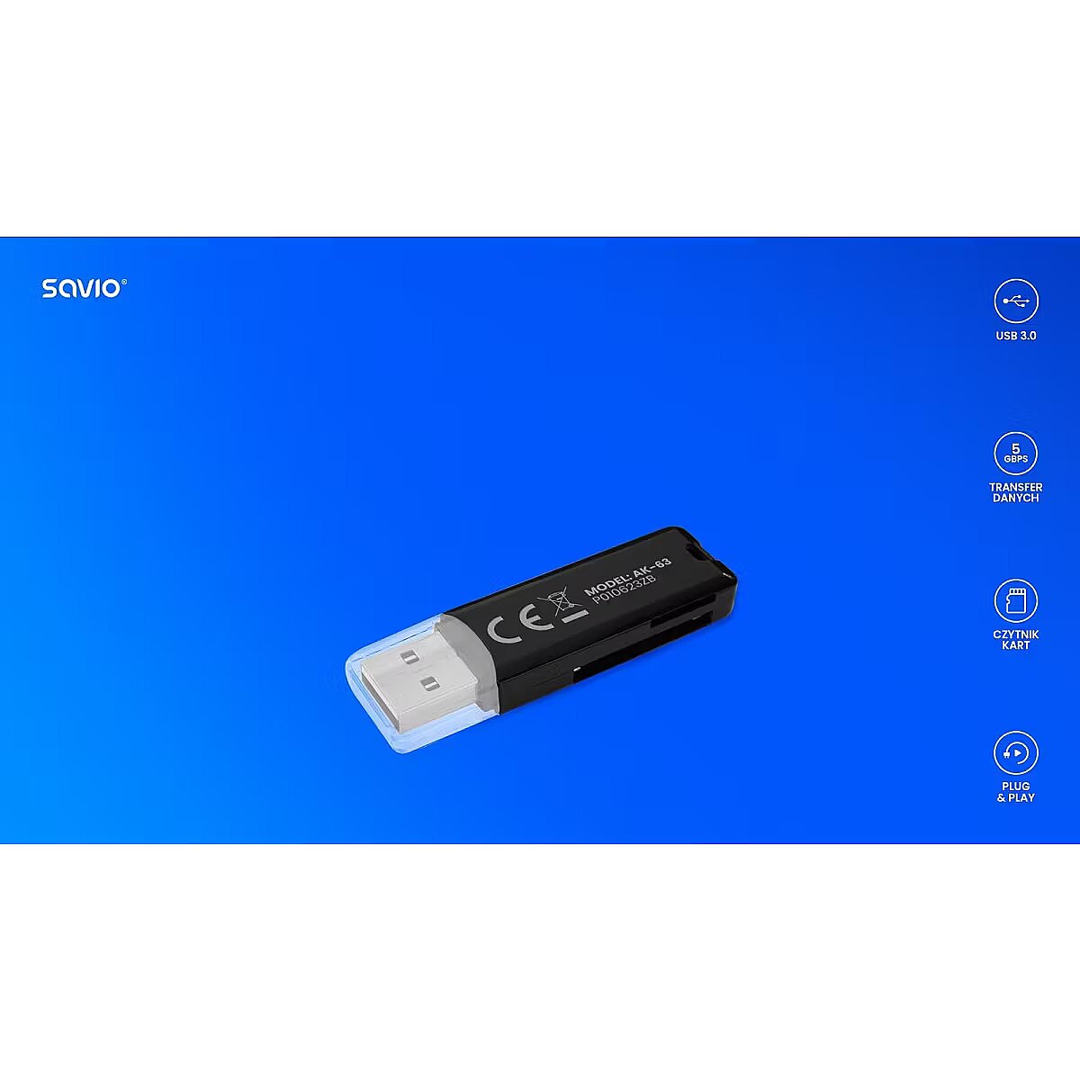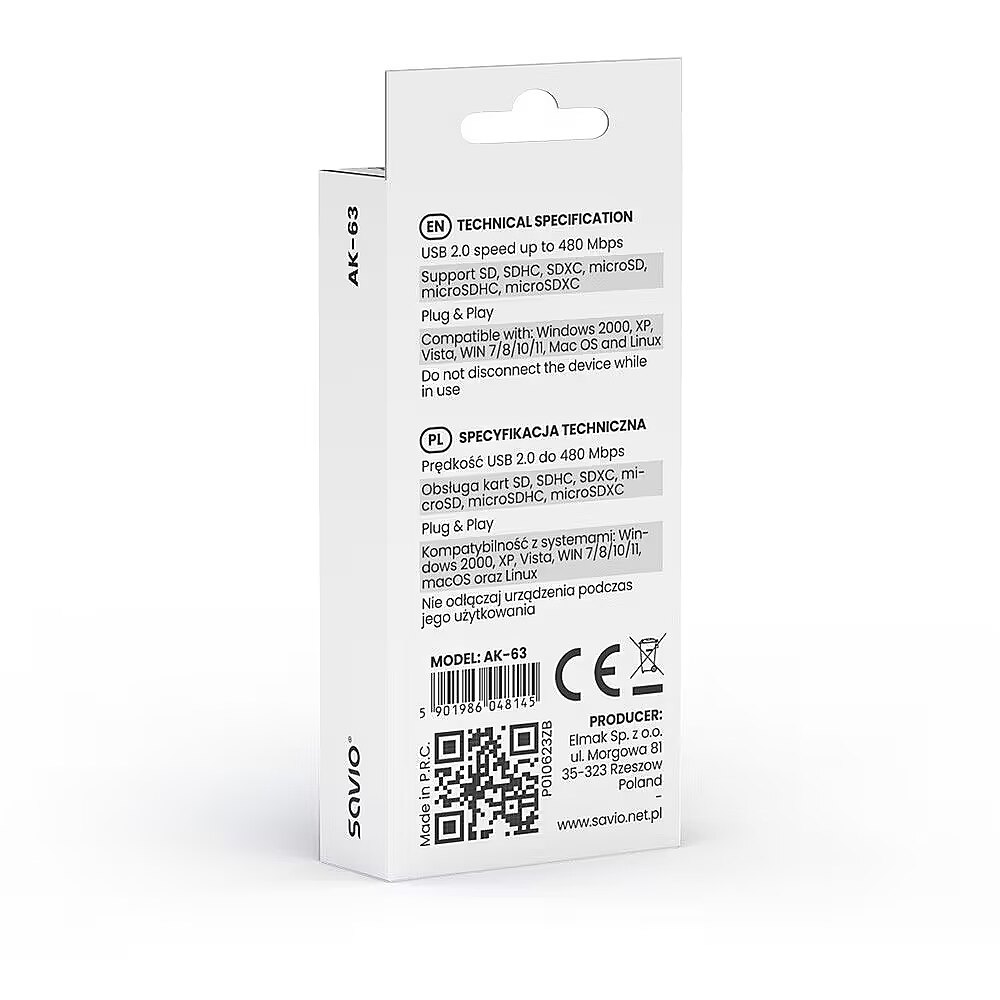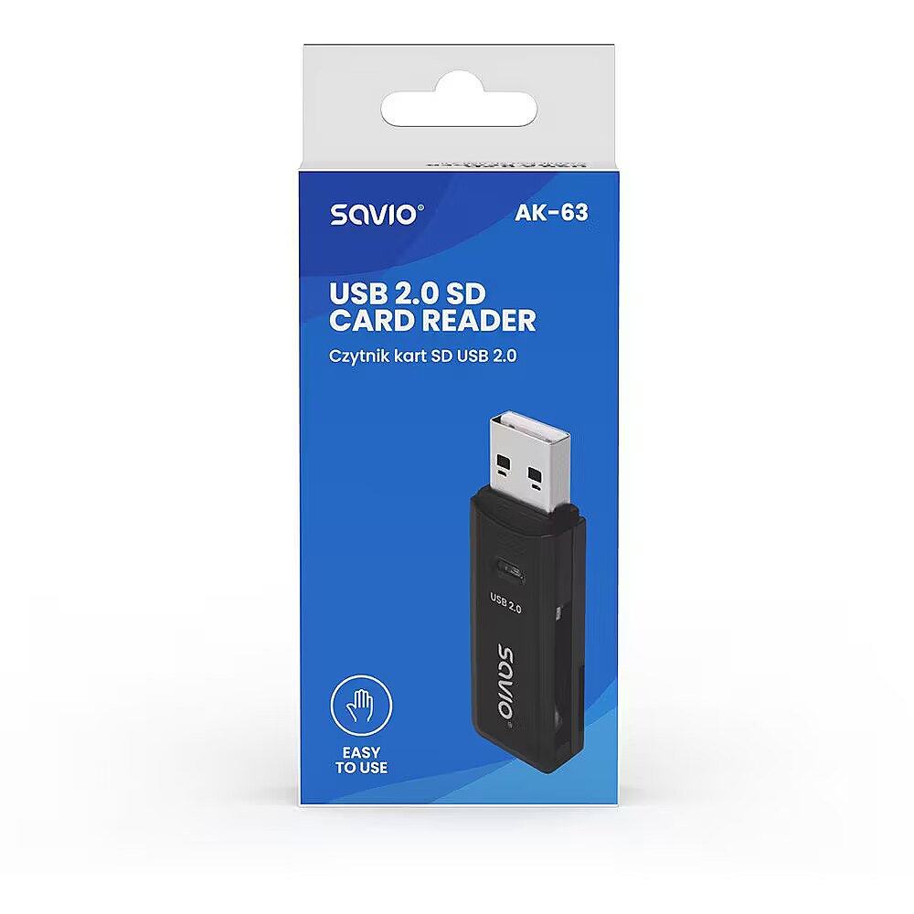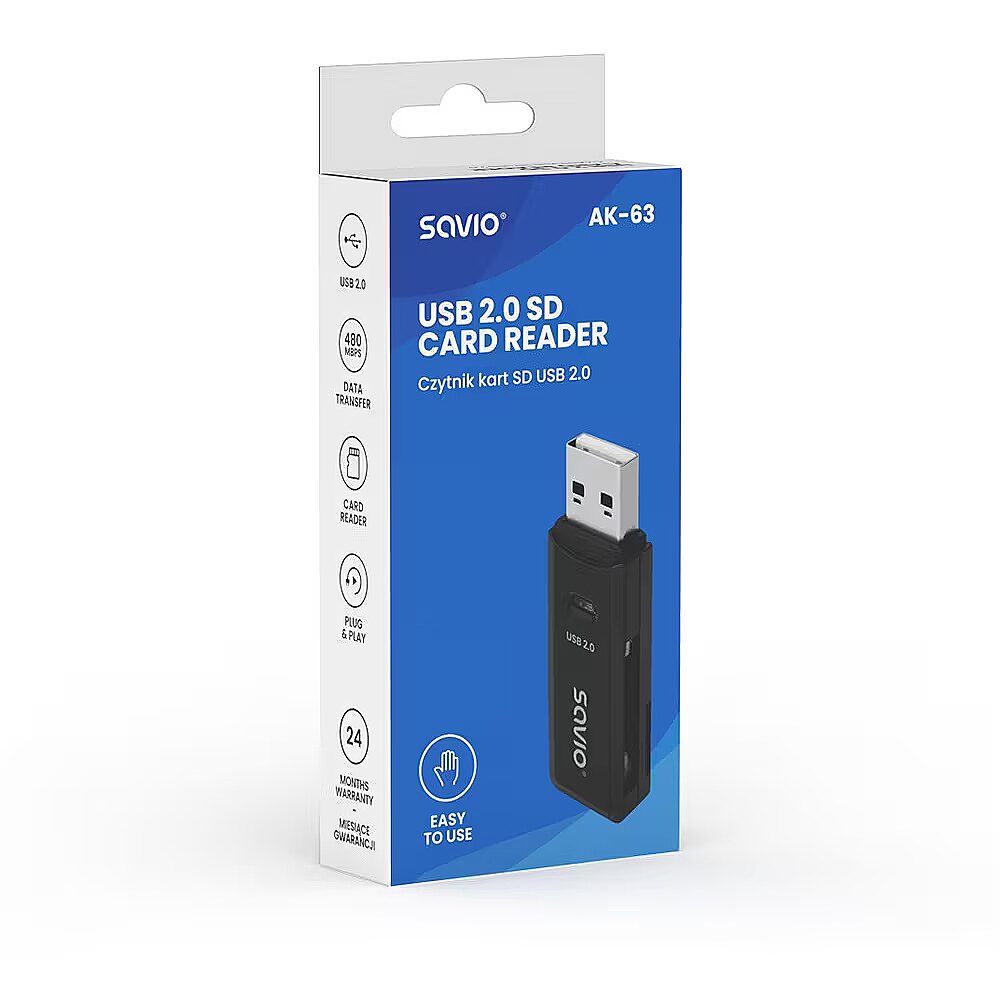 LargeDescHTML - The USB 2.0 SD card reader, AK-63, is a practical device that allows you to conveniently read data from different types of memory cards. With this compact and versatile gadget, transferring photos, files and other information from memory cards to your computer becomes quick and easy.Compatible with a wide range of mediaThe reader has been designed with wide compatibility in mind, covering a range of memory card types such as SD, SDHC, SDXC, microSD, microSDHC and microSDXC. This is ideal for those who use a wide variety of storage media.Plug & PlayThanks to the USB 2.0 interface, connecting the reader to your computer becomes extremely simple and intuitive. You do not need any additional drivers or programmes. The reader works in Plug & Play mode, which means that you can start using it as soon as it is connected.Simple operation of the reader with many systemsThe SAVIO AK-63 is compatible with various operating systems, such as Windows 2000, XP, Vista, WIN 7/8/10/11, macOS and Linux. No matter which system you use, you can enjoy convenient reading of data from memory cards.Remember not to unplug the device while it is running to avoid possible data problems.