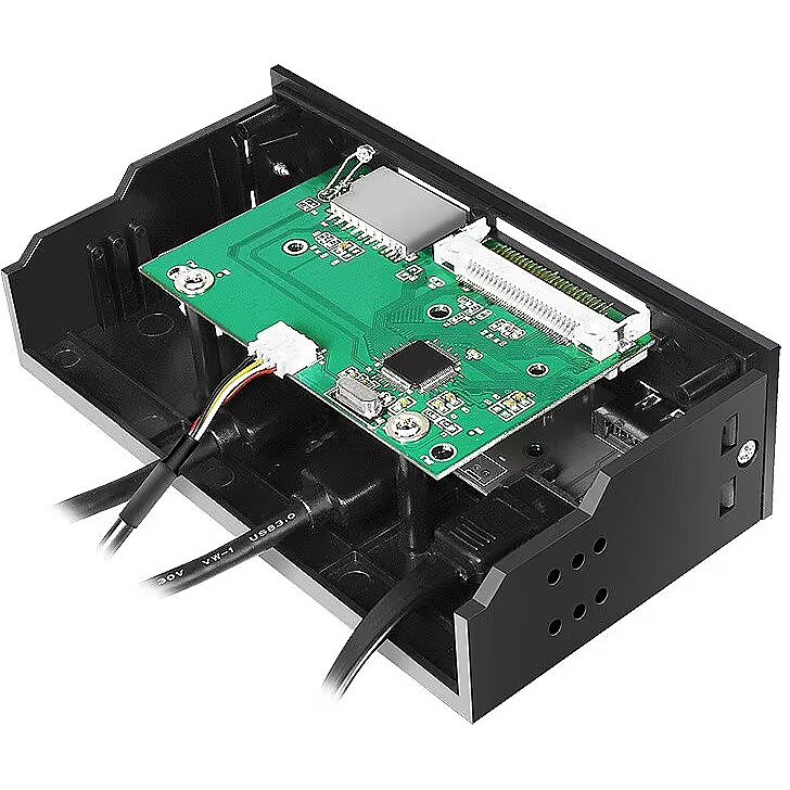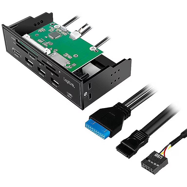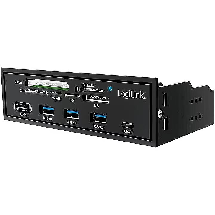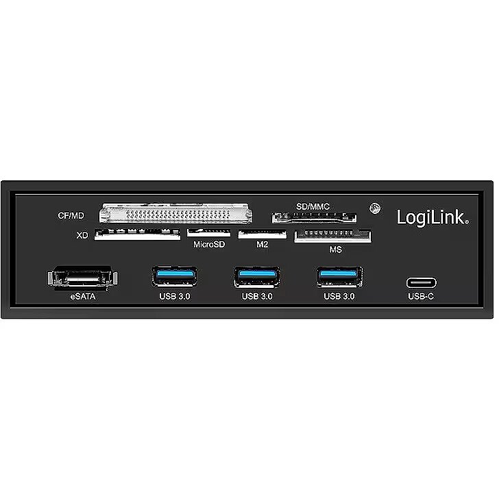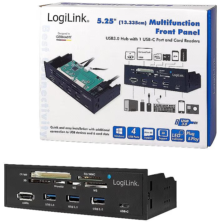 Description - With LogiLink's multifunction panel, you can quickly and easily expand your computer's connection options: you can now insert 6 different card types into the corresponding card slots, such as M2, MS, SD, microSD, XD or CF cards, and transfer their data. There are also three USB 3.0 Type-A, one USB Type-C, and one eSATA port to which you can connect additional devices. The multifunction panel can easily be mounted in the 5.25" front panel of a computer housing, giving you additional connection options.