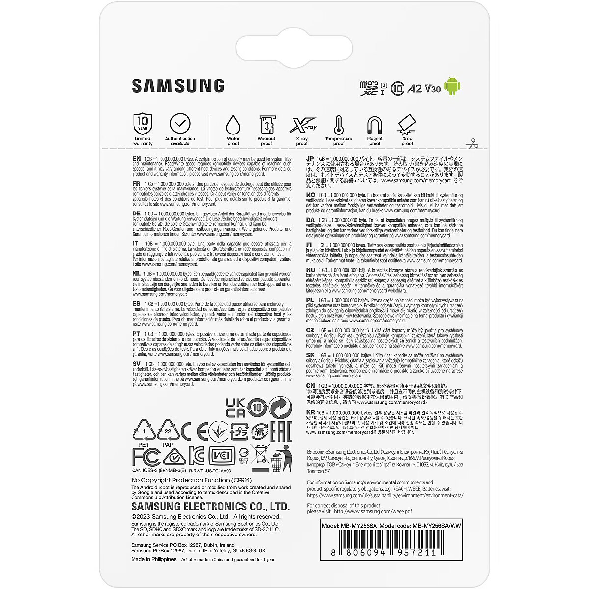 Description - MB-MY256SA/WW Pro Ultimate 256GB microSD memory card + Adapter An additional boost to creativity The PRO Ultimate UHS-I microSD card is designed to help users fully realize their creative potential. Thanks to incredibly fast and reliable performance, you can easily record 4K videos without delays from a drone or sports camera, as well as use the card as a medium for even the most demanding games. * For devices not compatible with the UHS-I interface, speeds depend on interface parameters. ** Records UHD 4K videos on 512, 256 and 128 GB cards. Host device compatibility may vary. Your speed of action More productivity and creativity with sequential read and write speeds of up to 200 and 130 MB/s. U3 and V30 ratings mean UHD 4K video capture is hassle-free, while A2 performance enables fast saves and loads even in multitasking and performance-hungry applications. *The above read and write speeds are based on internal tests conducted under controlled conditions. Actual speed depends on card capacity. The declared performance was achieved when using microSD PRO Ultimate cards with Samsung readers. ** UHS Speed Class 3 is the performance intended for recording UHD 4K videos on devices supporting the UHS standard. A constantly maintained writing speed of 30 MB/s (UHS V30 class) is the performance intended for real-time video recording in devices supporting the UHS standard. *** Recording UHD 4K videos (3840 x 2160) on cards with a capacity of 512, 256 and 128 GB. The compatibility of the card with the device depends on the host device. **** A2 performance means read and write speeds of 4000 and 2000 IOPS respectively. Everything in one place No matter how extensive your game or movie collection is, a 128GB to 512GB* microSD PRO Ultimate card should keep all your data safe and secure for quick and easy access, anytime, anywhere. * 1 GB = 1 billion bytes. Actual memory capacity may be smaller than nominal. Some memory may be used by system files and other memory management functions. *Test device: Galaxy Note 20 Ultra 5G 4K video: 3840*2160, 30fps (30min, 7.93GB) FHD video: 1920*1080, 30fps (30min, 2.95GB) ) 4K image: 4000 * 3000 (average size 2.36MB) FHD image: 4000 * 1868 (average size 1.81MB) Wide compatibility The PRO Ultimate microSD card is compatible with Android smartphones and tablets, intended mainly for intensive use of applications and saving files, also in cooperation with drones, sports cameras, laptops and portable game consoles. This is the optimal solution for both professional cameramen and gaming enthusiasts. Confidence and peace of mind You are in safe hands. With protection against 6 harmful elements*, including water, extreme temperatures, X-rays and even accidental drops, the microSD PRO Ultimate card can withstand almost anything, making it perfect for use on the go. * Water resistance: up to 72 hours of immersion to a depth of 2 meters in sea water. ** Temperature resistance: during operation from -25 to +85 °C, in idle state from -40 to +85 °C. *** X-ray resistance: up to 100 mGy (equivalent to airport scanners). Magnetic strength: up to 15,000 gauss (equivalent to a strong field from an MRI scanner). ****Fall resistance: from a height of up to 5 meters. *****Wear-resistant: up to 10,000 insertions and removals* Samsung is not responsible for any damage, data loss or recovery costs from the memory card.* Test results apply to the SD card, not the adapter or reader. The world's #1 flash memory Top performance and reliability from the world's best-selling flash memory brand since 2003* * Source: OMDIA data for 2003-2022: market shares of NAND memory suppliers.