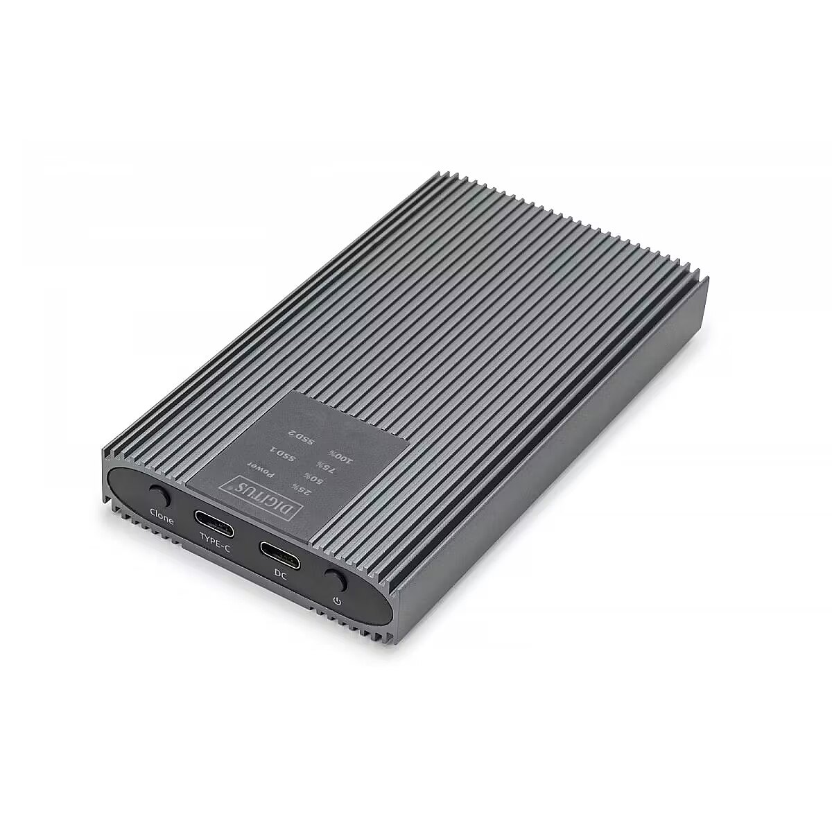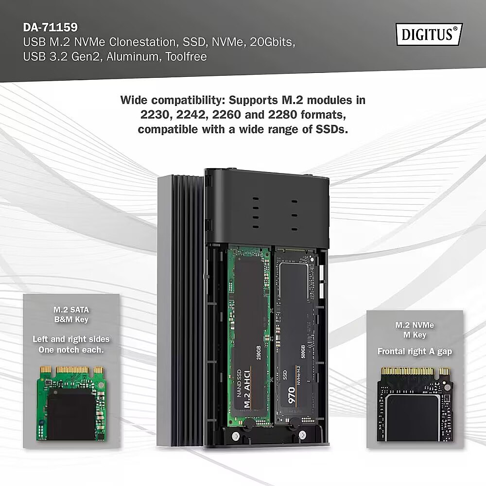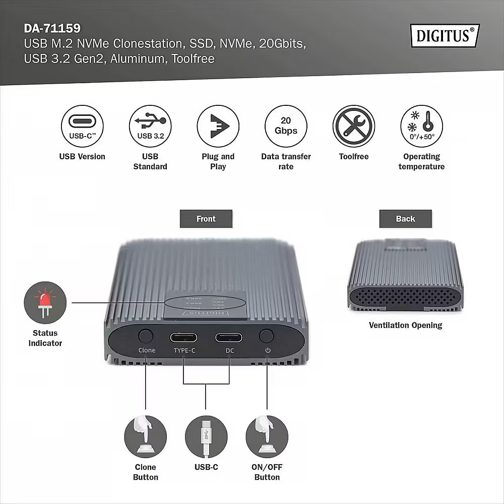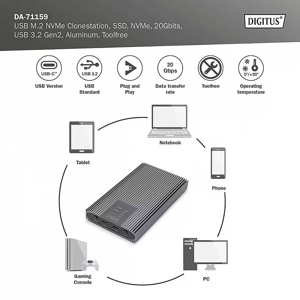 The DN-71559 NVMe Mobile Cloning Station is the best solution for fast and efficient data migration and backup. It supports M.2 Mini SSDs with M Key and B+M Key. With its USB 3.2 Type-C interface, it offers lightning-fast data transfer rates of up to 20 Gb/s, allowing you to copy large files in seconds. The solid and elegant aluminum housing provides excellent heat dissipation. Thanks to the integrated LED indicators, you always have an overview of the working status and progress of the cloning process. The compact and lightweight design makes it the ideal companion for mobile use, whether in the office, at home or on the go. The NVMe Cloning Station supports SSDs up to 8TB and is compatible with the most popular operating systems, such as Windows, macOS, and Linux, so it can be seamlessly integrated into your existing IT infrastructure. Whether you want to back up your system, move data between SSDs, or simply expand your storage capacity, the NVMe Mobile Cloning Station will get the job done quickly, safely, and efficiently. Wide Compatibility: Supports M.2 modules in 2230, 2242, 2260, and 2280 formats, compatible with a wide range of SSDs Large Capacity: Offers up to 8TB of storage space for all your files and data Fast Data Transfer: Up to 20Gbps data transfer speeds for fast file transfers and smooth operation USB 3.2 Interface: Latest USB technology with backward compatibility to USB 3.1, 3.0, 2.0, and 1.1 Plug and Play: Simply connect via USB and start working straight away Multi-platform support: Compatible with Windows, macOS, Linux, Google Chrome OS, Android, and iOS Robust Chipset: JMS586U chipset for reliable and efficient operation LED Activity Indicator: Integrated LED indicator to monitor the status of the SSD Durable and Stylish: Pantone 430C aluminum housing with excellent passive heat dissipation Portable design: Compact and lightweight with dimensions of 116x60x20mm and weighing only 155g