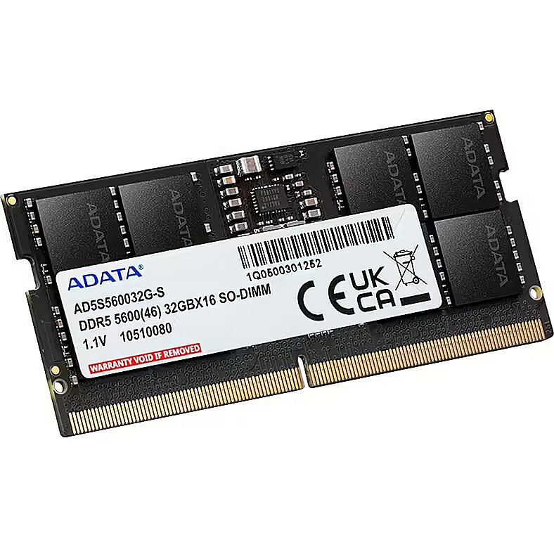 LongSummaryDescription - ADATA AD5S560032G-S. Component for: Laptop, Internal memory: 32 GB, Memory layout (modules x size): 1 x 32 GB, Internal memory type: DDR5, Memory clock speed: 5600 MHz, Memory form factor: 262-pin SO-DIMM, CAS latency: 46, ECC
