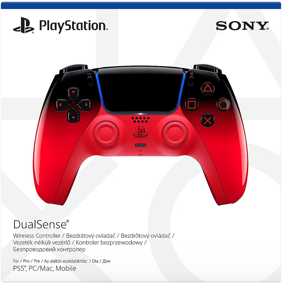 LongSummaryDescription - Sony DualSense. Device type: Gamepad, Gaming platforms supported: PlayStation 5, Gaming control function buttons: D-pad, Menu button, Microphone mute button. Connectivity technology: Wired & Wireless, Device interface: Bluetooth/USB, USB connector type: USB Type-C. Product colour: Black, Red. Power source: Battery. Width: 188 mm, Depth: 69 mm, Height: 189 mm
