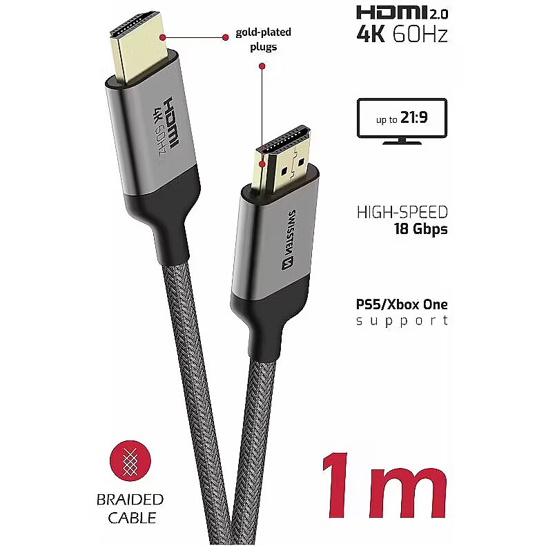 description_en - Are you looking for a quality braided HDMI cable that will transmit the image with the sound of your device and in 4K quality with a refresh rate of 60Hz? You found it right! Swissten is a great variant of the HDMI interface for image and sound transmission using an HDMI 2.0 cable and, at the same time, 4 audio tracks and 32 sound channels. Thanks to several smart functions that the cable has, it fulfills the requirements of practically every customer. These include VRR, HDR, QMS, and more.