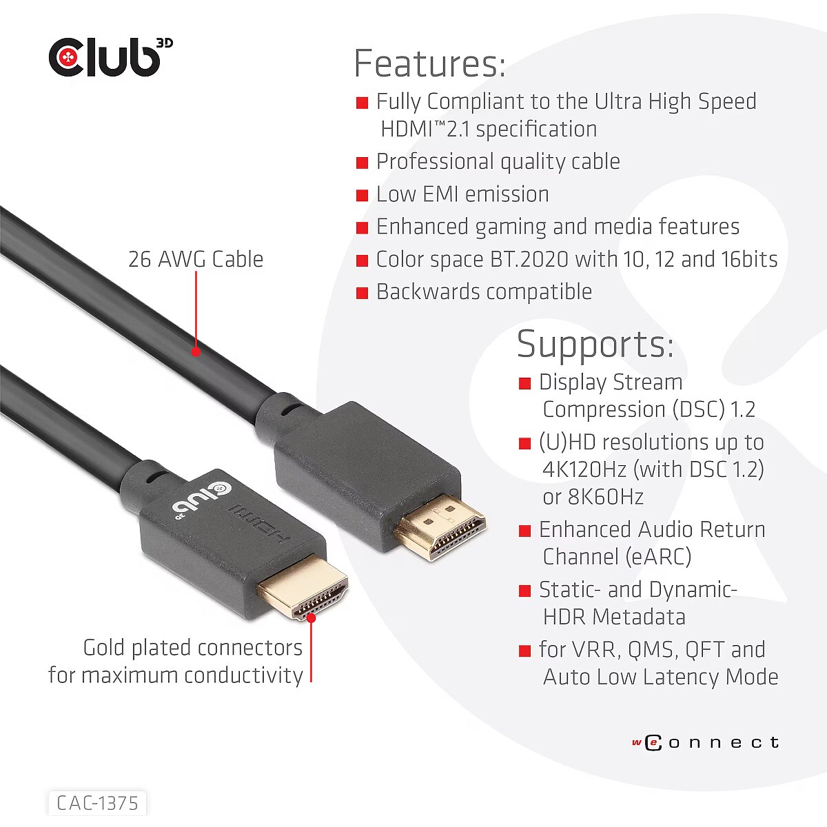 LongDesc - The Club 3D CAC-1375 Ultra High Speed HDMI™2.1 Certified Cable is built to handle the highest quality video- and audio- signals.HDMI™2.1 Increased Bandwidth to 48Gbps.The increase in maximum bandwidth compared to previous versions is achieved by increasing both the bitrate of the data channels (from 6Gbps to 12Gbps) and the number of channels (from 3 to 4). This allows support for resolutions up to supports 4K at 120Hz or 8K at 60Hz! New feature included in this Specification is Display Stream Compression (DSC) 1.2, this is used for video formats higher than 8K with 4:2:0.Enhanced refresh rate features:- Variable Refresh Rate (VRR) reduces or eliminates lag, stutter and frame tearing for more fluid motion in games- Quick Media Switching (QMS) for movies and video eliminates the delay that can result in blank screens before content is displayed- Quick Frame Transport (QFT) reduces latency.- HDMI™2.1 also supports Static- and Dynamic HDR metadata.All HDMI™2.1 features are fully supported by this Club 3D CAC-1375 Cable. It is the ideal solution for the ultimate future proof HDMI™2.1 experience.