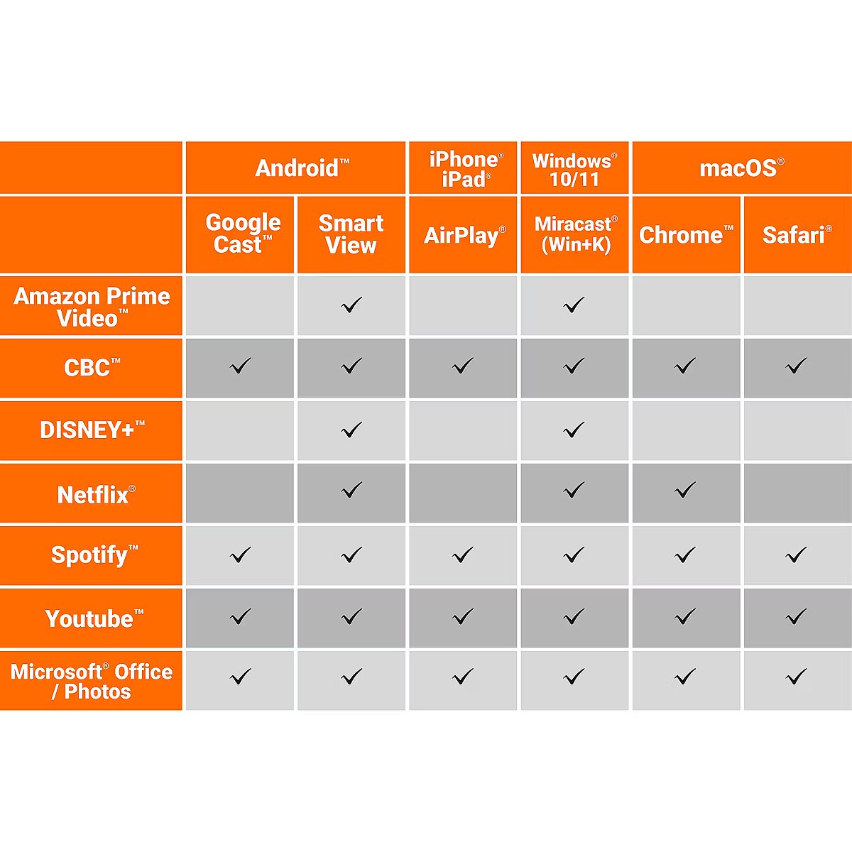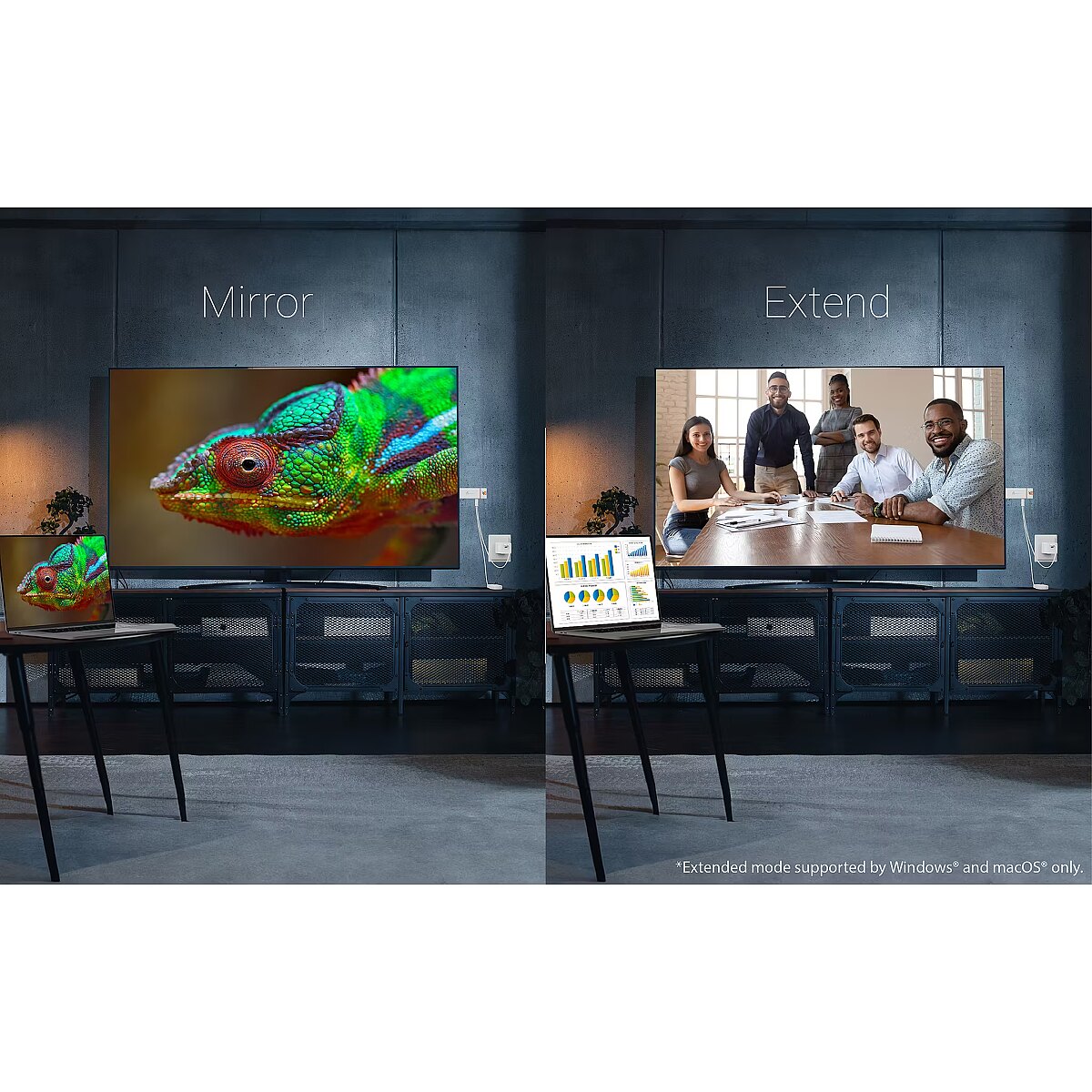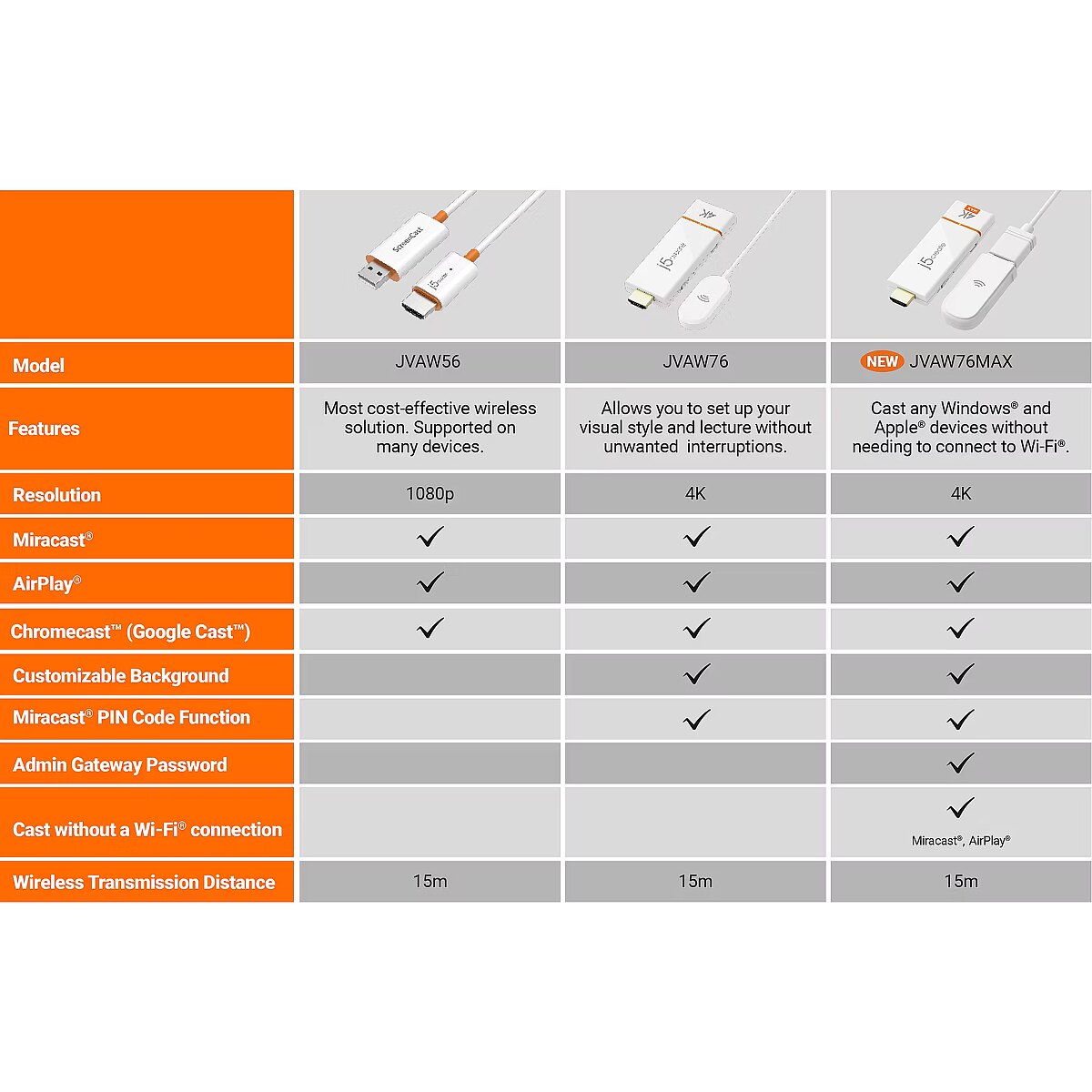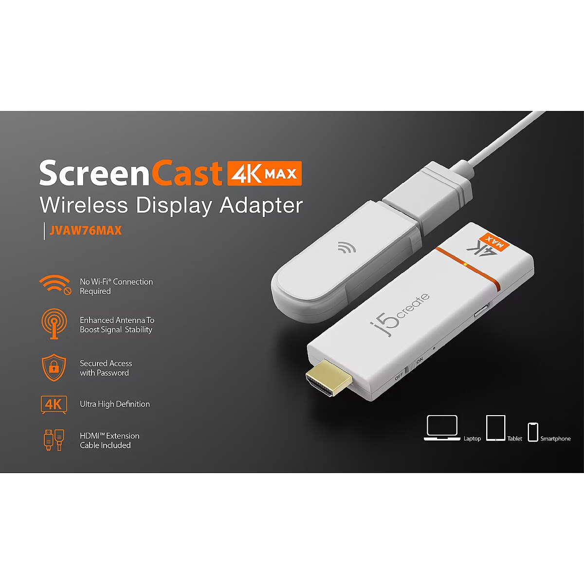 LongDesc - Wirelessly display content from a phone, tablet, or laptop onto a bigger screen with the ScreenCast 4K Max Wireless Display Adapter. Cast to TVs, projectors, and monitors. With its support of multiple wireless display standards (Miracast™, AirPlay®, and Chromecast™), this wireless display adapter is compatible with mobile devices you already own, including Windows®, macOS®, iOS®, Android™ and other cast compatible laptops, tablets, and mobile phones. In addition to its compact design, the ScreenCast 4K Max Wireless Display Adapter features an external antenna for enhanced signal coverage, making it perfect for home use and travel. The JVAW76MAX adds more features for business or education scenarios, such as Point-to-Point mode (use your Windows® device, Mac®, iPad®, or iPhone® without setting up a Wi-Fi® connection). A customizable background image gives you the ability to better express your corporate identity. Includes a Miracast™ pin code feature for additional security.