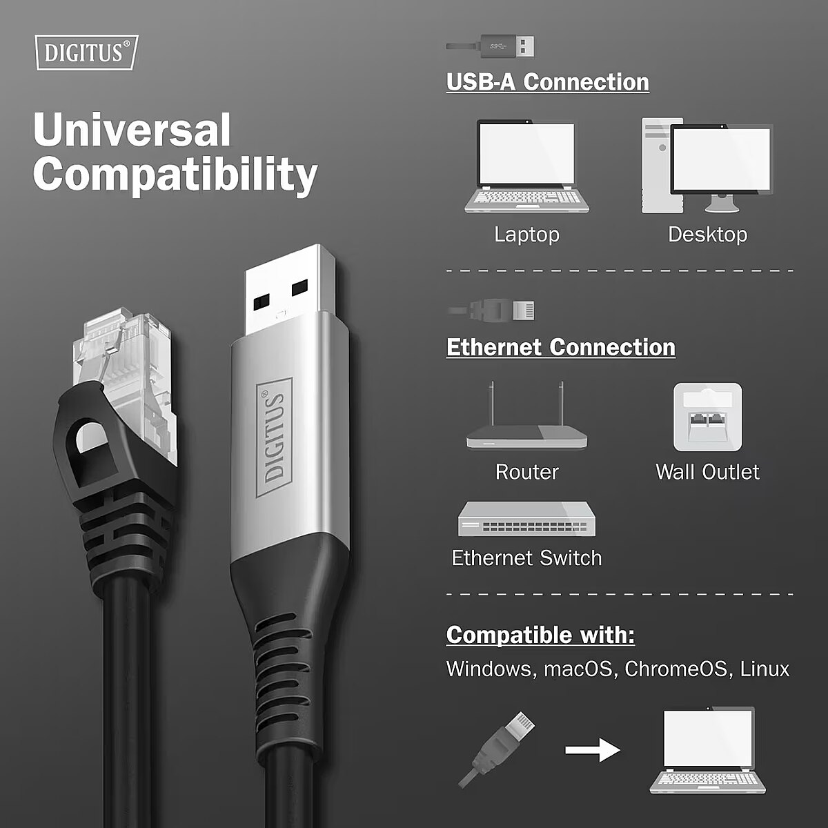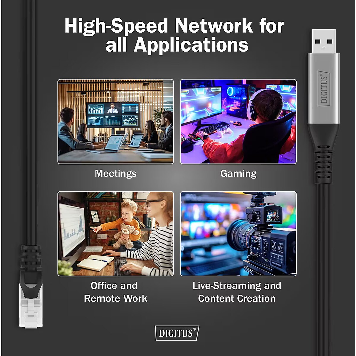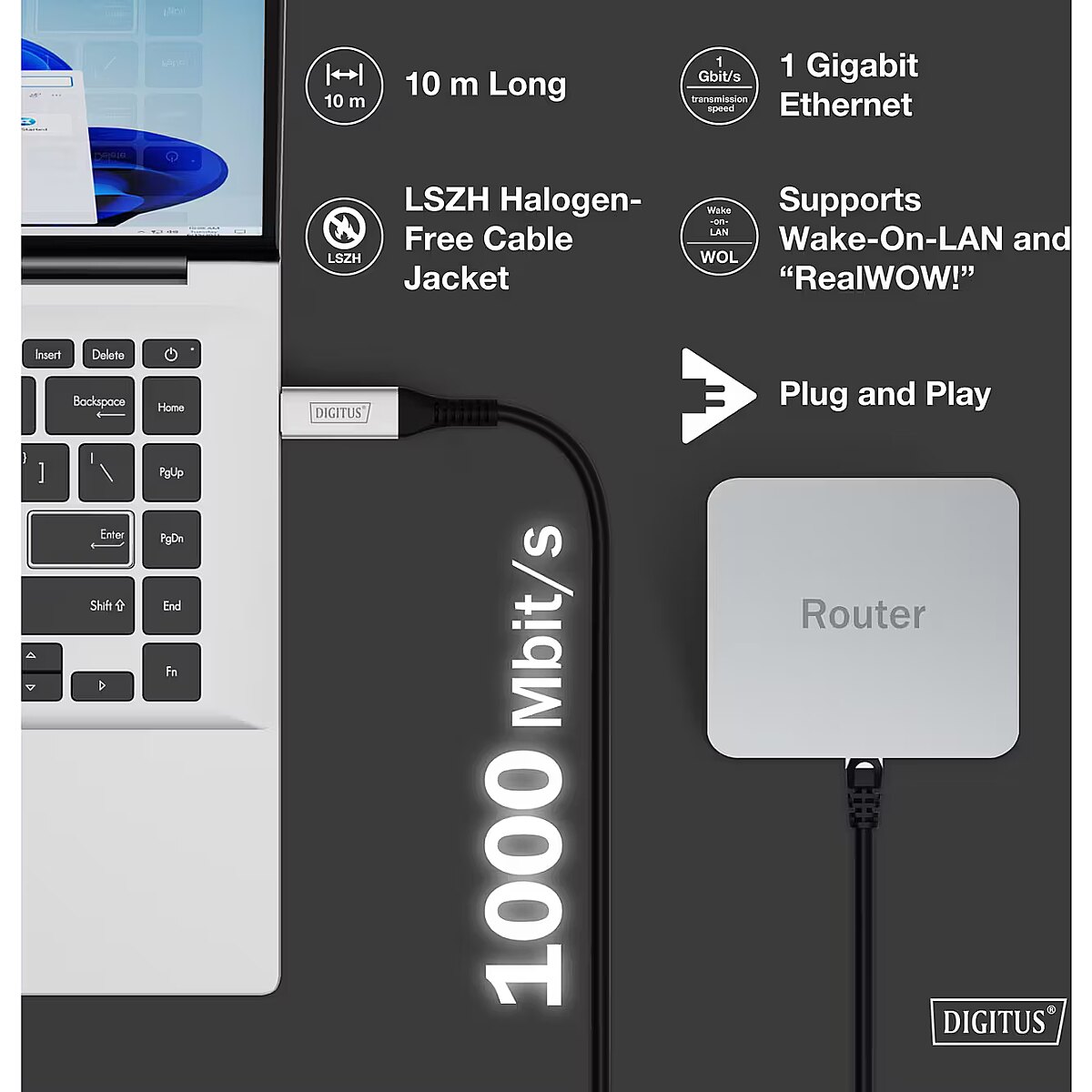 Digitus USB-A to RJ45 Ethernet Cable, 1Gbit/s, 10m