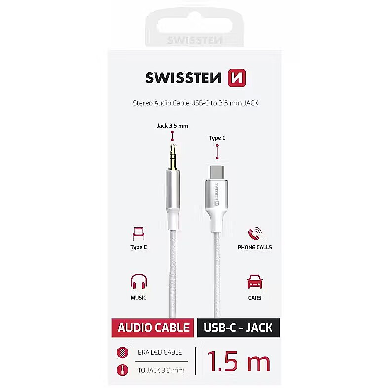 description_en - The SWISSTEN Textile USB-C / 3.5mm JACK audio adapter in black color and 1.5 m long is a great choice. Thanks to this adapter, you can easily connect your favorite headphones or speakers with a 3.5mm AUX input to devices with a USB-C connector, which is especially appreciated by users of modern phones and tablets without a traditional audio jack.