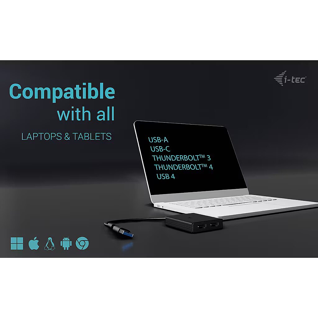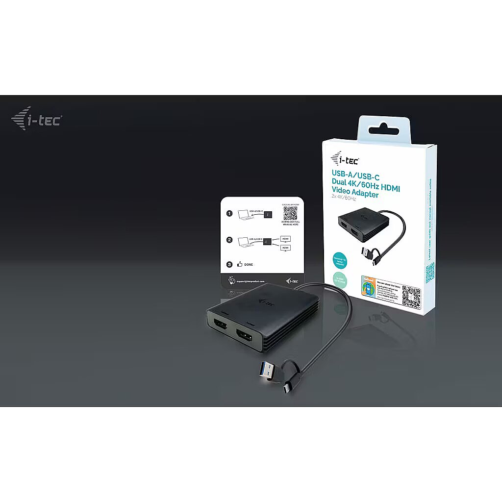 ShortSummaryDescription - i-tec USB-A/USB-C Dual 4K/60 Hz HDMI Video Adapter, 0.27 m, USB Type-A/USB Type-C, 2 x HDMI, Male, Female, 3840 x 2160 pixels