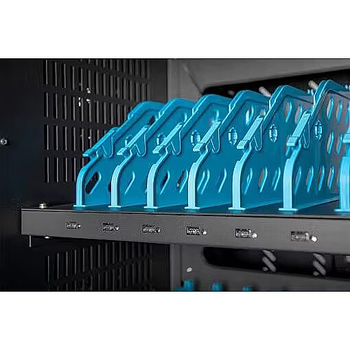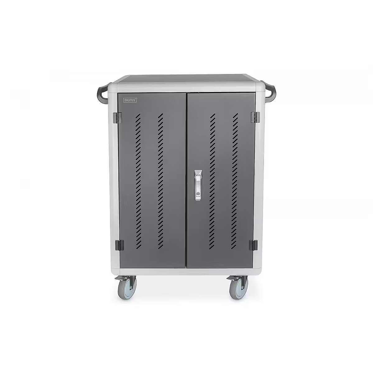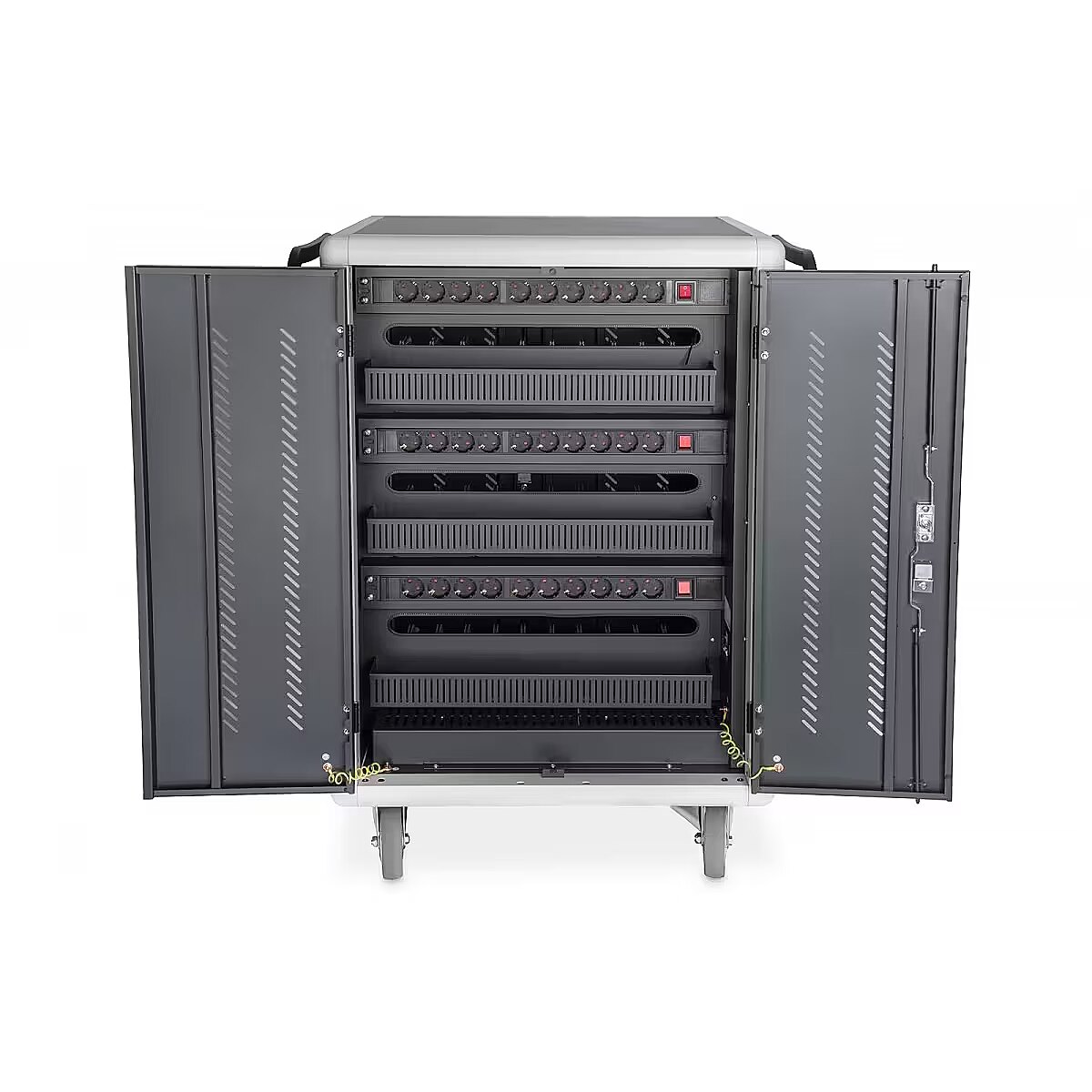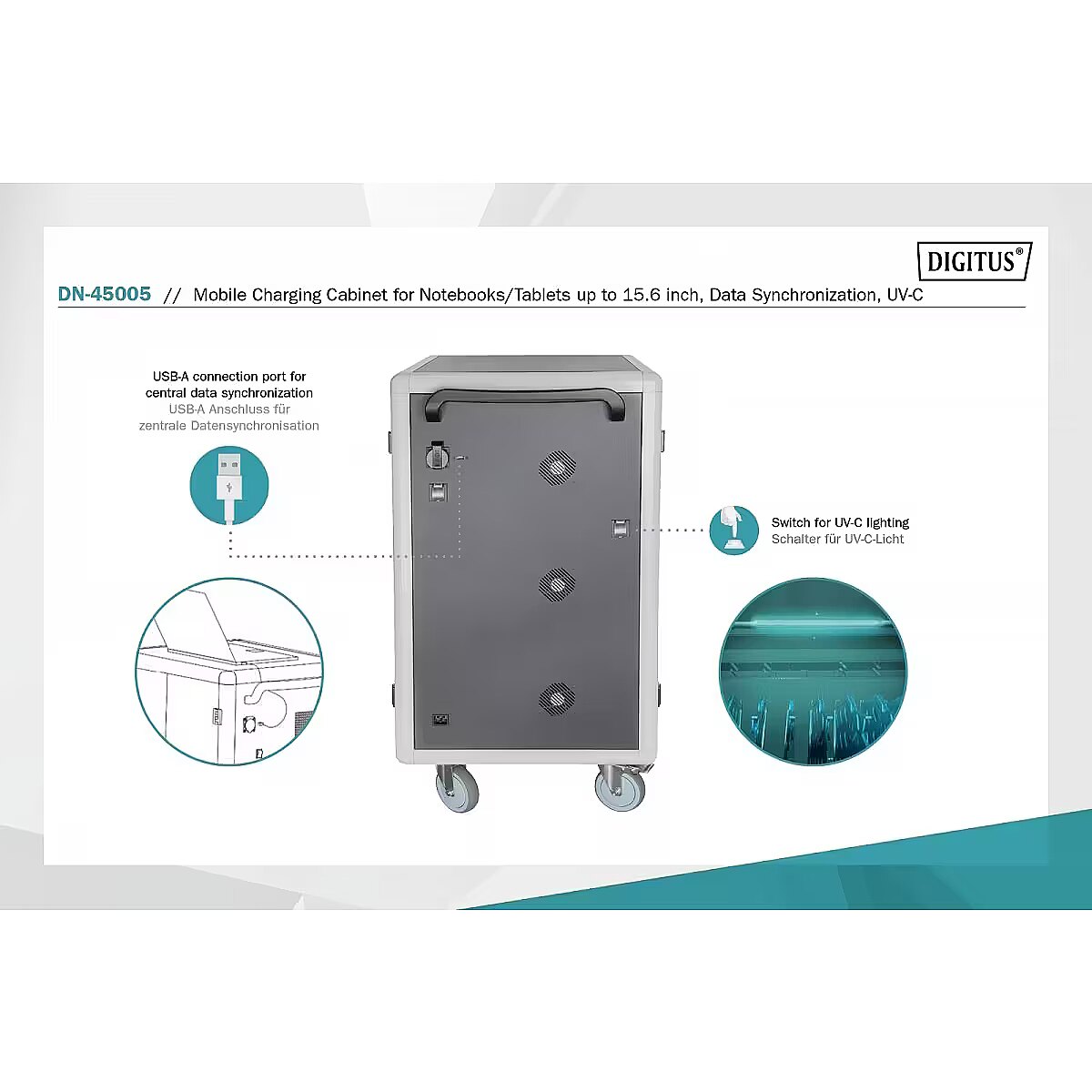 Description - An ideal solution for sterile storage and charging of portable devices via USB-A connectors with the possibility of data synchronization The DIGITUS mobile charging cabinet is the ideal and compact solution for storing and charging mobile devices such as notebooks and tablets. Mobile charging cabinets are often used in public facilities such as schools to safely store devices in one place and also charge them at the same time. The cabinet contains 3 rows of 10 chargers, each with its own USB port on the front. Additionally, devices can be connected at the rear using built-in socket strips (3 x 10-way with protective contact). Thanks to large cable guides and long shelves, optimal cable management is ensured. Built-in fans (3 x 24 V) combined with ventilation slots ensure active cooling of the cabinet. Integrated UV-C lamps ensure sterile conditions, and therefore ecology and better hygiene. The device can be connected to an external USB port to perform centralized data synchronization. 30 places (3 x 10) for devices 30 x USB A connectors USB A port output capacity: 10W (5V 2.1A) per port; max. 300 W 3 x rear socket strip (10 x socket with protective contact, complete with switch) Cable guide and space for excess cables on each level Compact housing, mobile thanks to mounted wheels 3 x fans (24 V) for active cooling of the cabinet The fans start automatically when the inside temperature exceeds 40°C With 30 mA residual current circuit breaker Double doors front and rear Pressure locking system with handle on front and rear doors, lockable Door opening angle 180° 2-point locking (bar lock) 4 castors (2 with brakes) Handles for easy movement (included) Protective contact connection (AC) with switch on the side C20 connector on the side of the cabinet The product is delivered assembled Inner shelf depth: 415 mm (suitable for devices up to 15.6'') The wheels can be removed if necessary