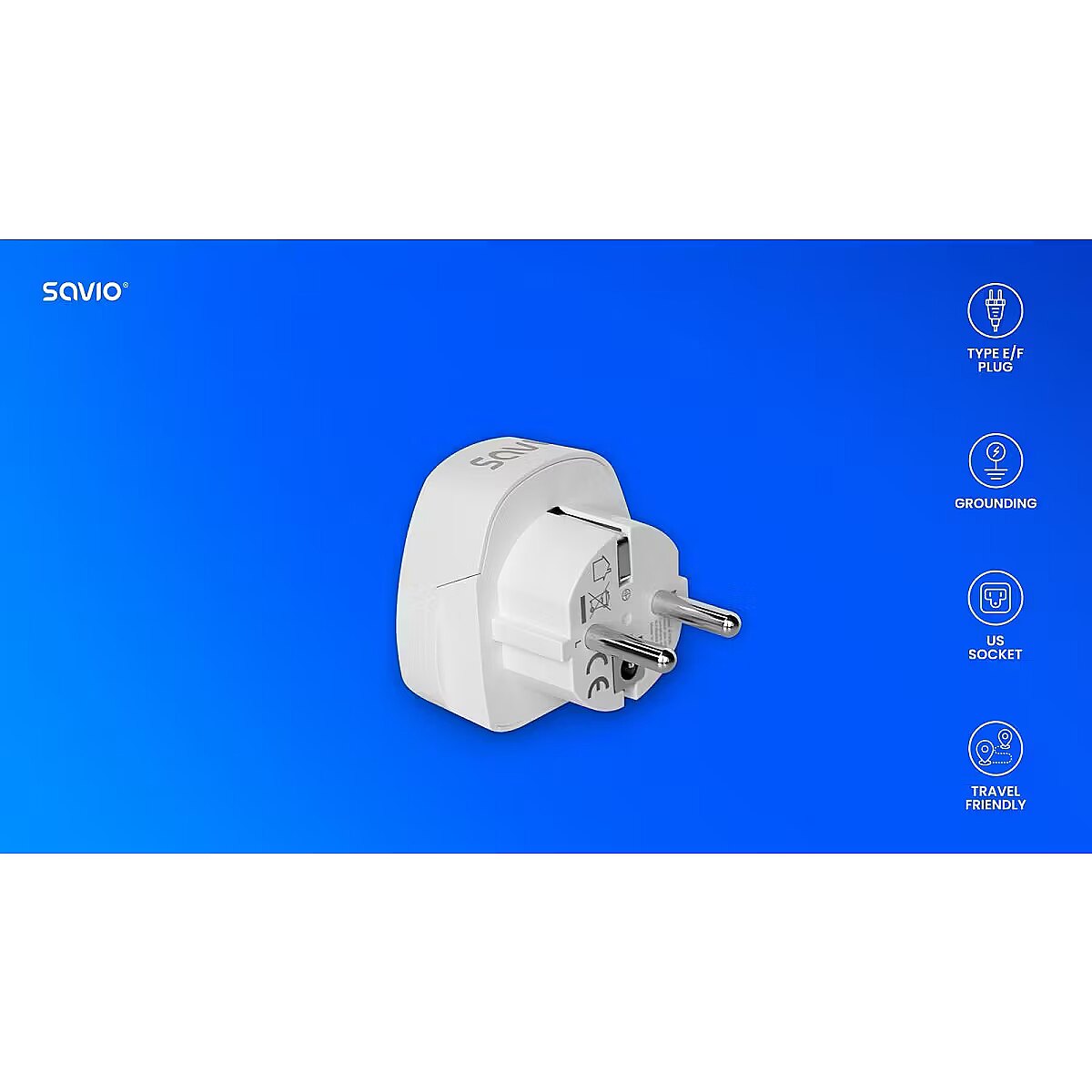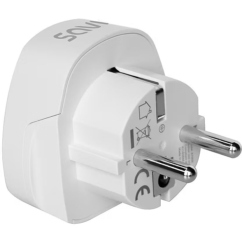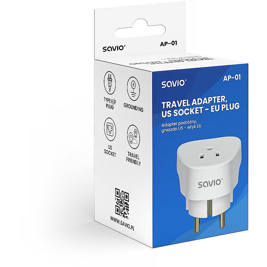 Description - Travel adapter, US socket - EU plug AP-01   The AP-01 travel adapter is an essential accessory for those travelling between the US and Europe. It enables devices with a US plug to be connected to European sockets (EU). This solution allows you to use your electronics freely during your trip. Thanks to its compact and lightweight design, the adapter will easily fit into any travel bag.   Compactness Easy to use and versatile For use with earthed and ungrounded devices   Why choose a Savio travel adapter?   The AP-01 adapter with EU plug and US socket provides convenience and safety when using American electrical appliances in Europe. This small device has a number of practical features, including:   easy connection of various electrical appliances (e.g. hairdryer, smartphone) to the US plug in countries with German and French socket systems; convenient transportation thanks to its compact size and lightweight design; compatibility of the Savio adapter with type A and B plugs and for use with type E and F sockets, the so-called European 3-pin sockets; safety of use thanks to earthing; high load power - up to 3750 W.   Configurators   Country of origin:   Antigua and Barbuda, Bahamas, Barbados, Belize, Bermuda, Bolivia, Cambodia, China, Colombia, Costa Rica, Cuba, Democratic Republic of the Congo, Ecuador, El Salvador, French Polynesia, Guam, Guatemala, Guyana, Haiti, Honduras, Jamaica, Japan, Canada, Laos, Lebanon, Liberia, Mexico, Micronesia, Netherlands Antilles, Nicaragua, Peru, Philippines, Puerto Rico, Saint Vincent, Saudi Arabia, Tahiti, Taiwan, Thailand, Trinidad and Tobago, US Virgin Islands, United States of America, Venezuela, Vietnam, Yemen   Destination country:   Liberia, Madagascar, Mali, Martinique, Monaco, Mongolia, Morocco, Niger, Poland, Reunion, Saint Vincent and the Grenadines, Senegal, Slovakia, Syrian Arab Republic, East Timor, Tunisia, Afghanistan, Albania, Algeria, American Samoa, Andorra, Armenia, Aruba, Austria, Azerbaijan, Belarus, Bhutan, Bosnia and Herzegovina, Bulgaria, Cape Verde, Chad, Croatia, Denmark, Egypt, Estonia, Ethiopia, Faroe Islands, Finland, Georgia, Germany, Greece, Greenland, Guinea, Hungary, Iceland, Indonesia, Iran, Italy, Jordan, Kazakhstan, Democratic People's Republic of Korea, Republic of Korea, Kyrgyzstan, Lao People's Democratic Republic, Latvia, Liberia, Libya, Lithuania, Luxembourg, Macao, Macedonia, Moldova, Monaco, Montenegro, Mozambique, Myanmar, Netherlands, Netherlands Antilles, New Caledonia, Niger, Norway, Portugal, Romania, Russia, San Marino, So Tomé and Príncipe, Serbia, Slovenia, Spain, Suriname, Sweden, Tajikistan, Thailand, East Timor, Turkey, Turkmenistan, Ukraine, Uruguay, Vietnam, Bahrain