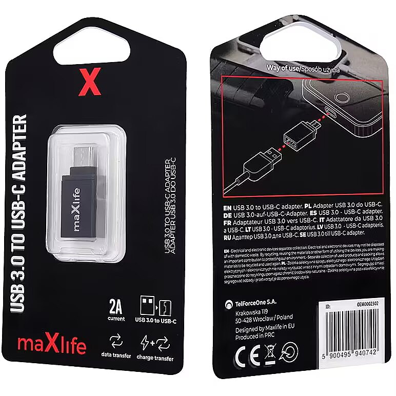 description_en - The Maxlife brand adapter is an adapter from USB 3.0 to USB-C. It enables charging and data transmission. Compatible with smartphones, tablets, laptops etc. equipped with a USB type connector.