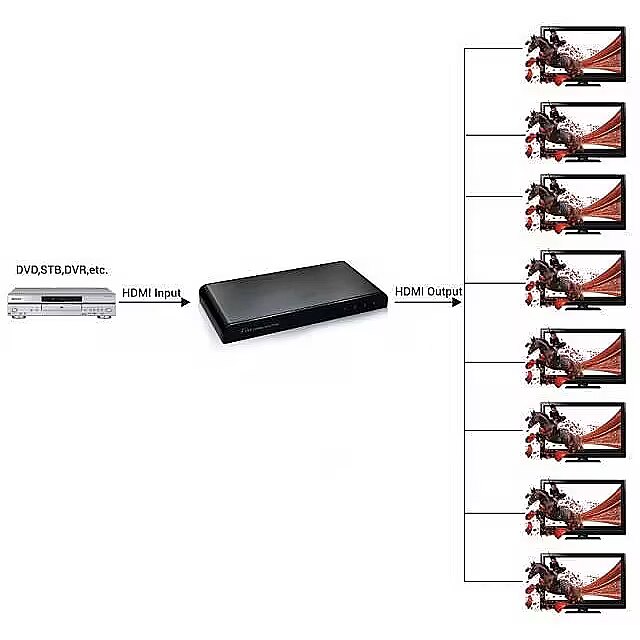 LongDesc - HDMI splitter IDATA HDMI2-4K8 simultaneously deploy the image and sound of an HDMI source (such as a Blu-ray player, PS3 or similar devices) up to 8 screens (such as LED / Plasma TVs and projectors). The splitter is compatible with HDMI 2.0 and supports all common formats HDMI. It supports 3D Full HD 1080p and the new format high 4Kx2K resolution. It can also be placed at the end of a long HDMI cable line to play the HDMI signal.It offers HD video distribution solutions ideal for supermarkets, shopping centers, showrooms, as well as for home entertainment systems.