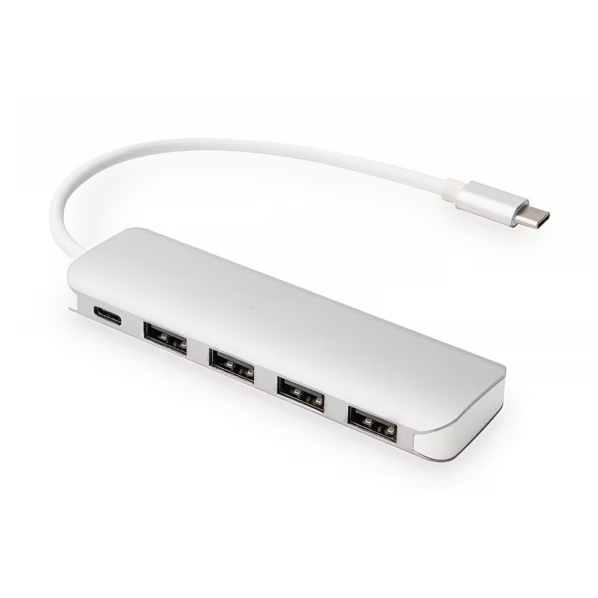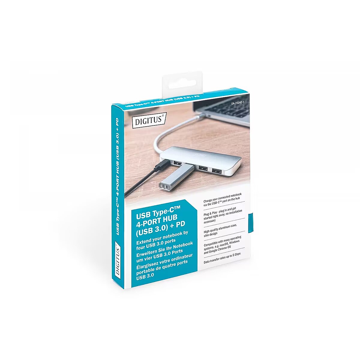 Description - 4-port USB 3.0 SuperSpeed HUB with Type C PD active, aluminum Expands a notebook with a USB-C port by four USB 3.0 ports + one USB-C port with laptop charging (PD) and USB 3.0 (BC) charging if the power adapter is connected to the USB-C port. With the 4-port USB Type-C hub, you can expand your laptop with a USB-C port by four USB 3.0 ports. There is also a USB-C (PD) port in the hub, through which you can charge your laptop. The 4-port USB-C hub from Digitus is thanks to its slim design the ideal solution for travel, but also necessary at home and in the office.