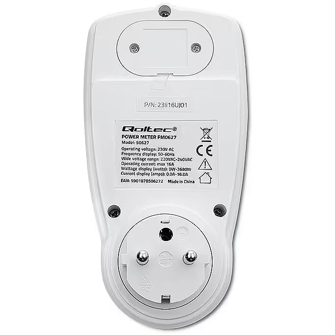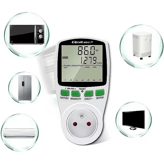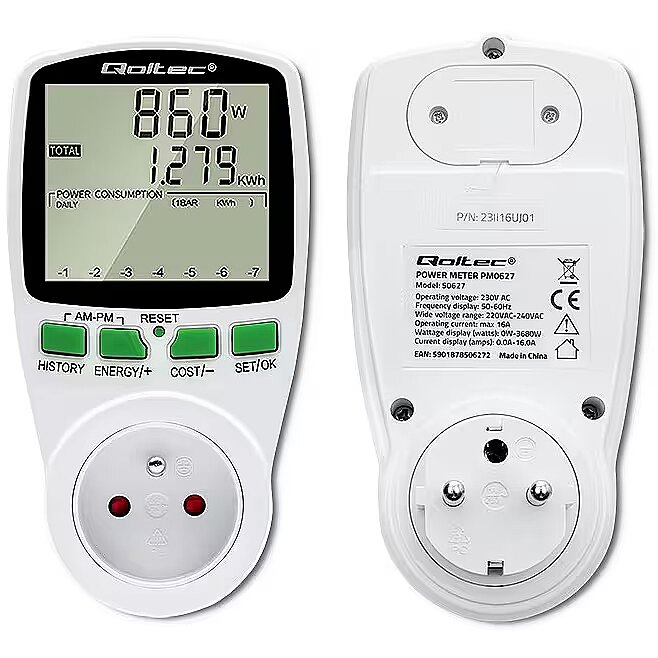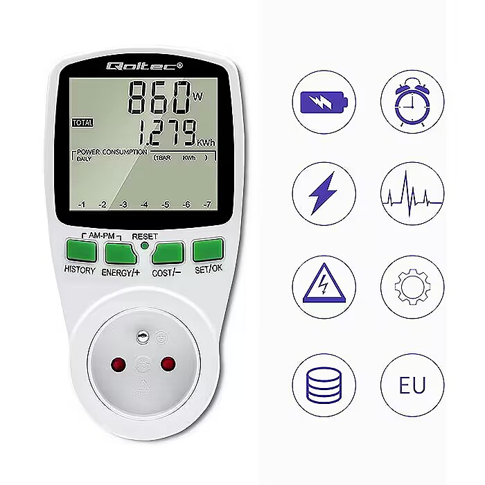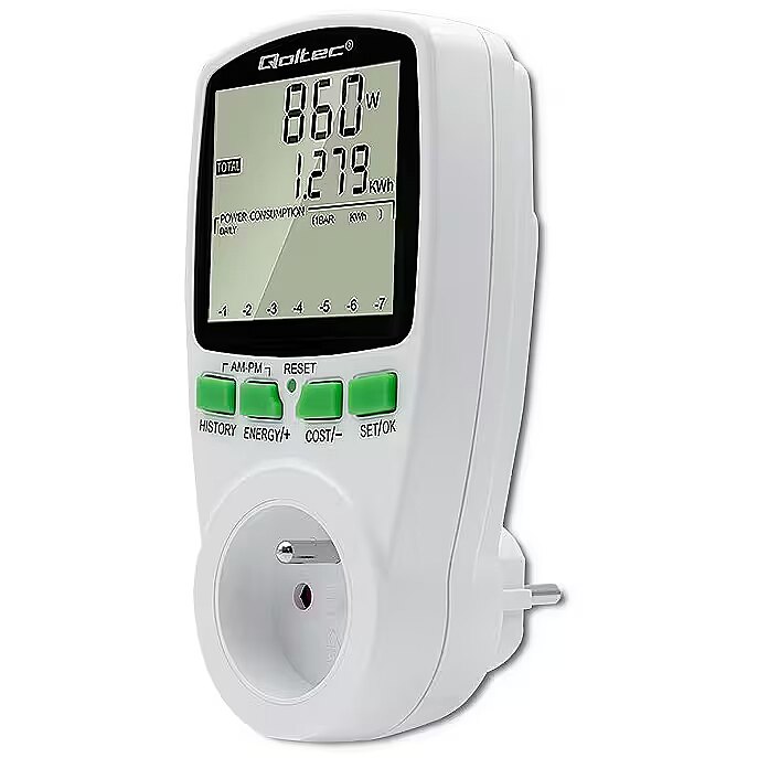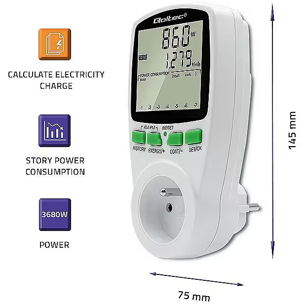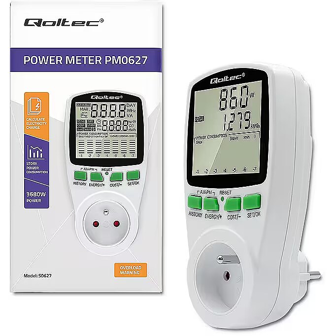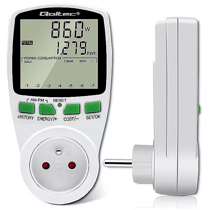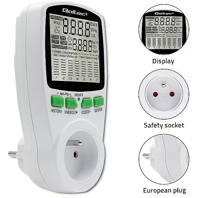 Using the Qoltec power consumption meter, you gain precise readings, not estimates, so you are able to accurately calculate the cost of the electricity consumed and check the effectiveness of the saving methods you are using.