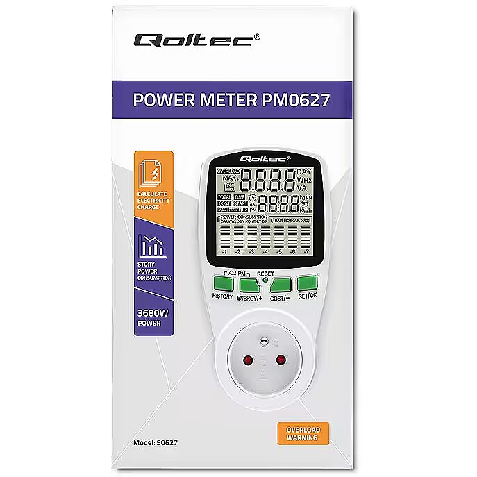 Qoltec 50627 Power meter PM0627 with history / 3680W / 16A / LCD