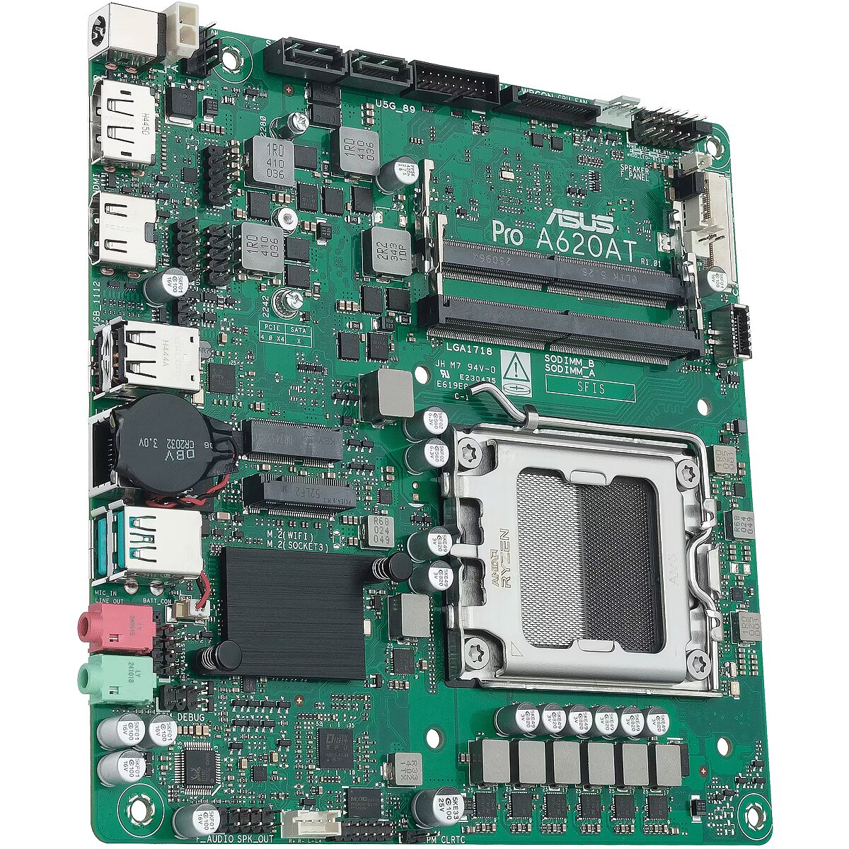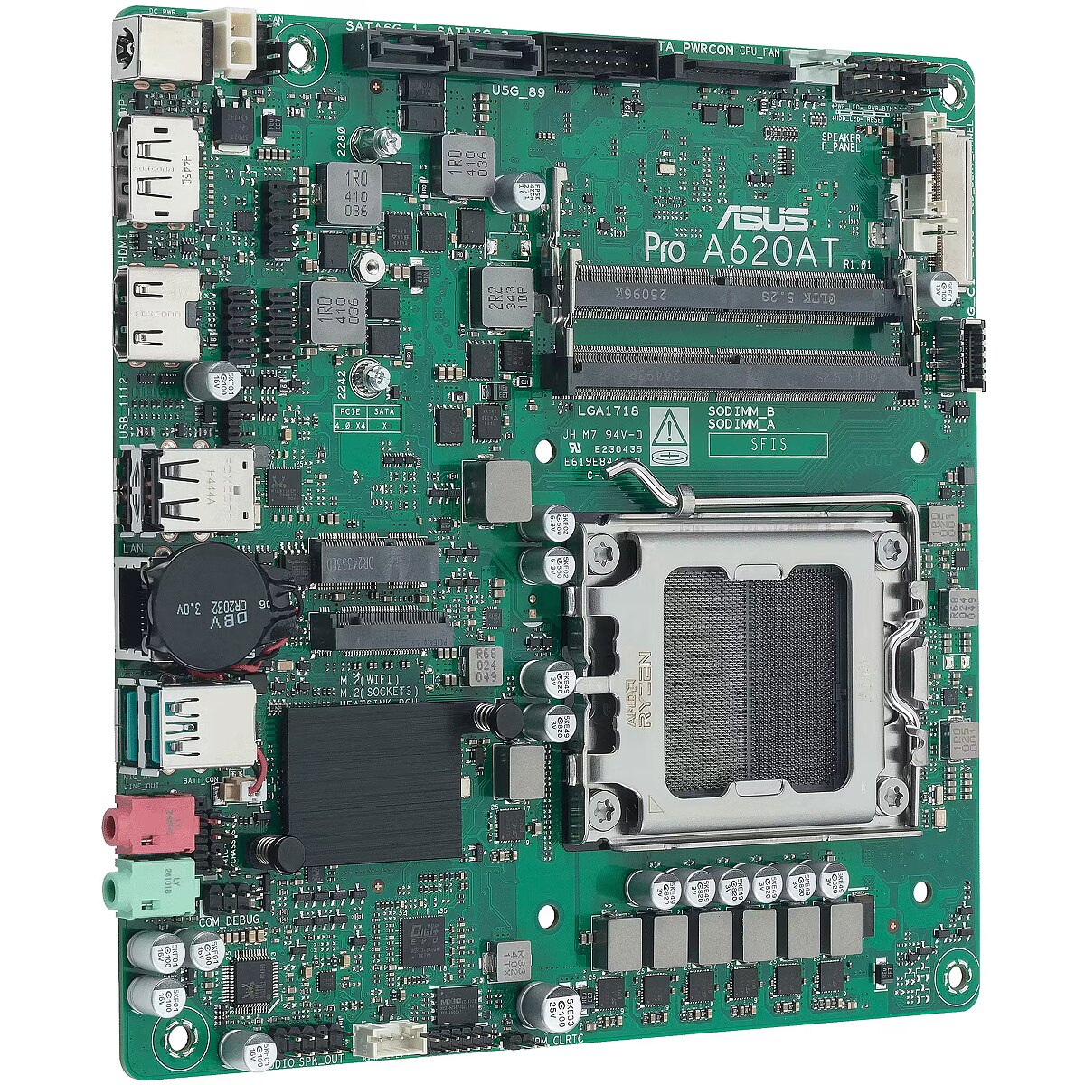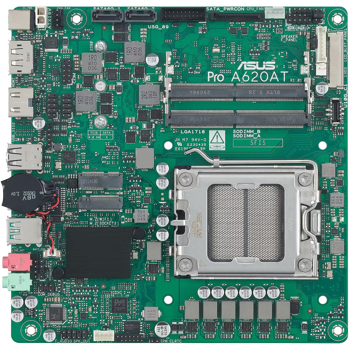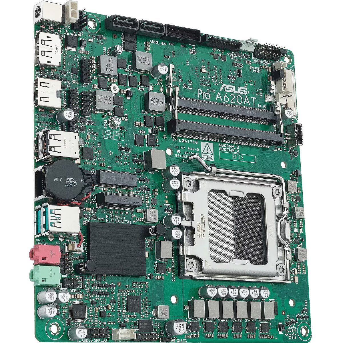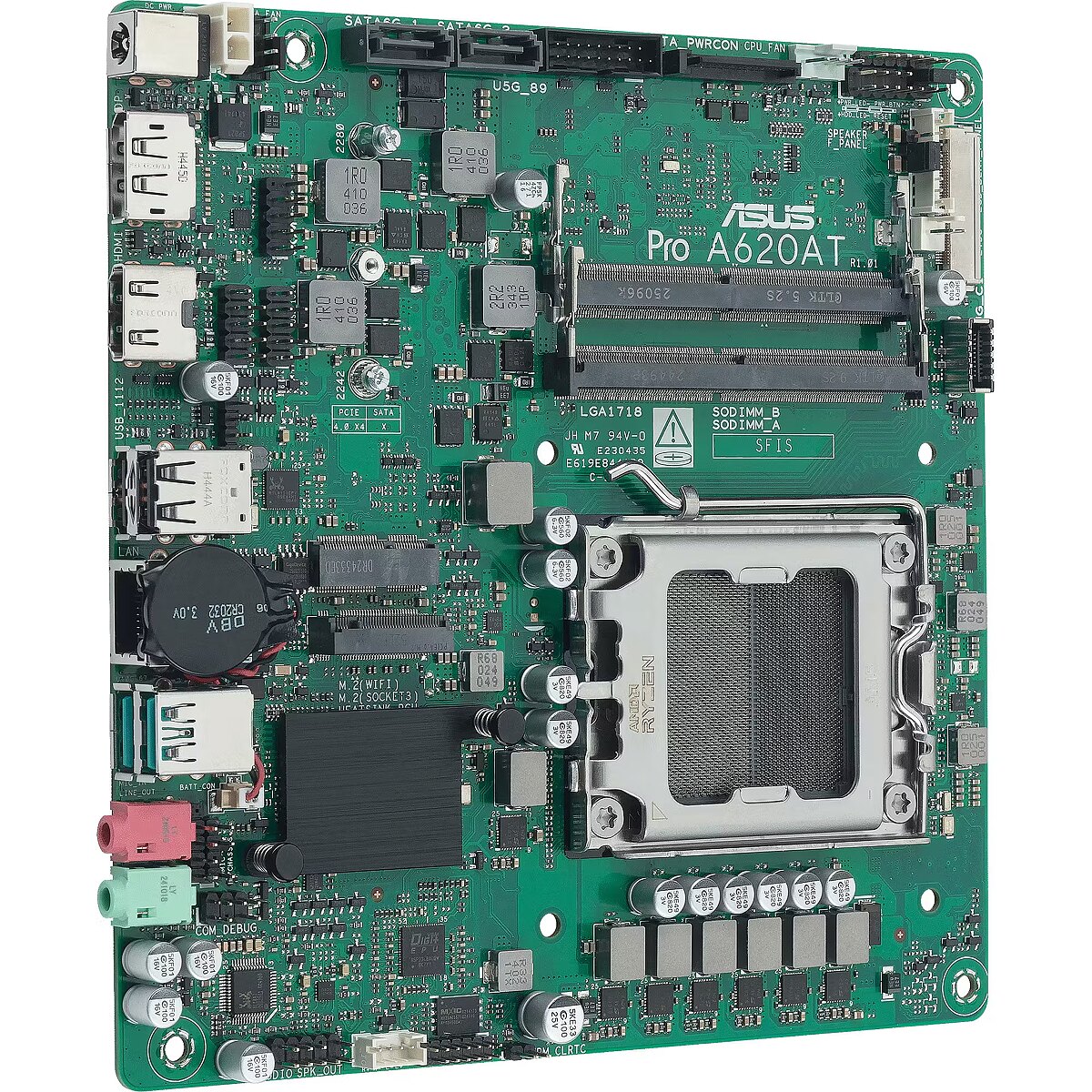 LongSummaryDescription - ASUS Pro A620AT-CSM. Processor manufacturer: AMD, Processor socket: Socket AM5, Compatible processor series: AMD Ryzen 7000 Series, AMD Ryzen 8000 Series, AMD Ryzen 9000 Series. Supported memory types: DDR5-SDRAM, Maximum internal memory: 128 GB, Memory slots type: SO-DIMM. Supported storage drive interfaces: M.2, PCI Express 4.0, SATA III, Supported storage drive types: HDD & SSD. Maximum resolution: 3840 x 2160 pixels. Component for: PC, Motherboard form factor: Thin Mini ITX, Motherboard chipset family: AMD