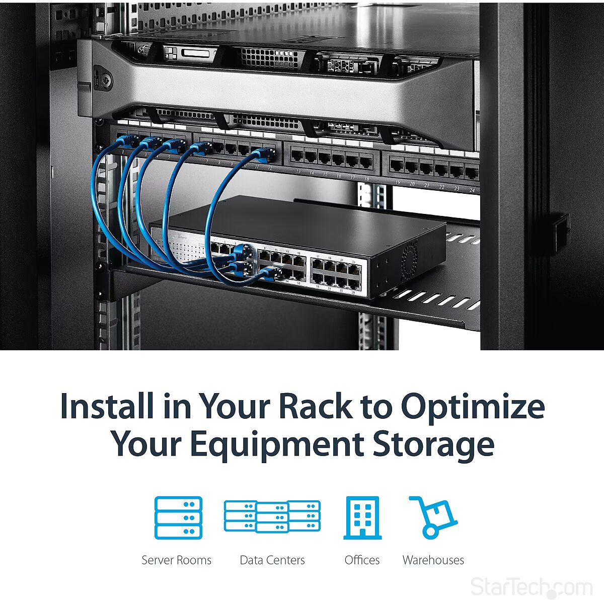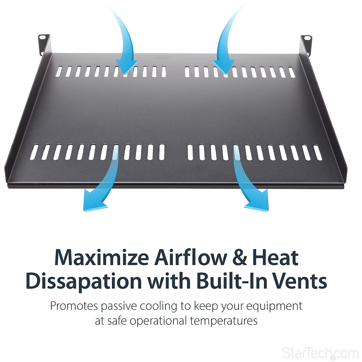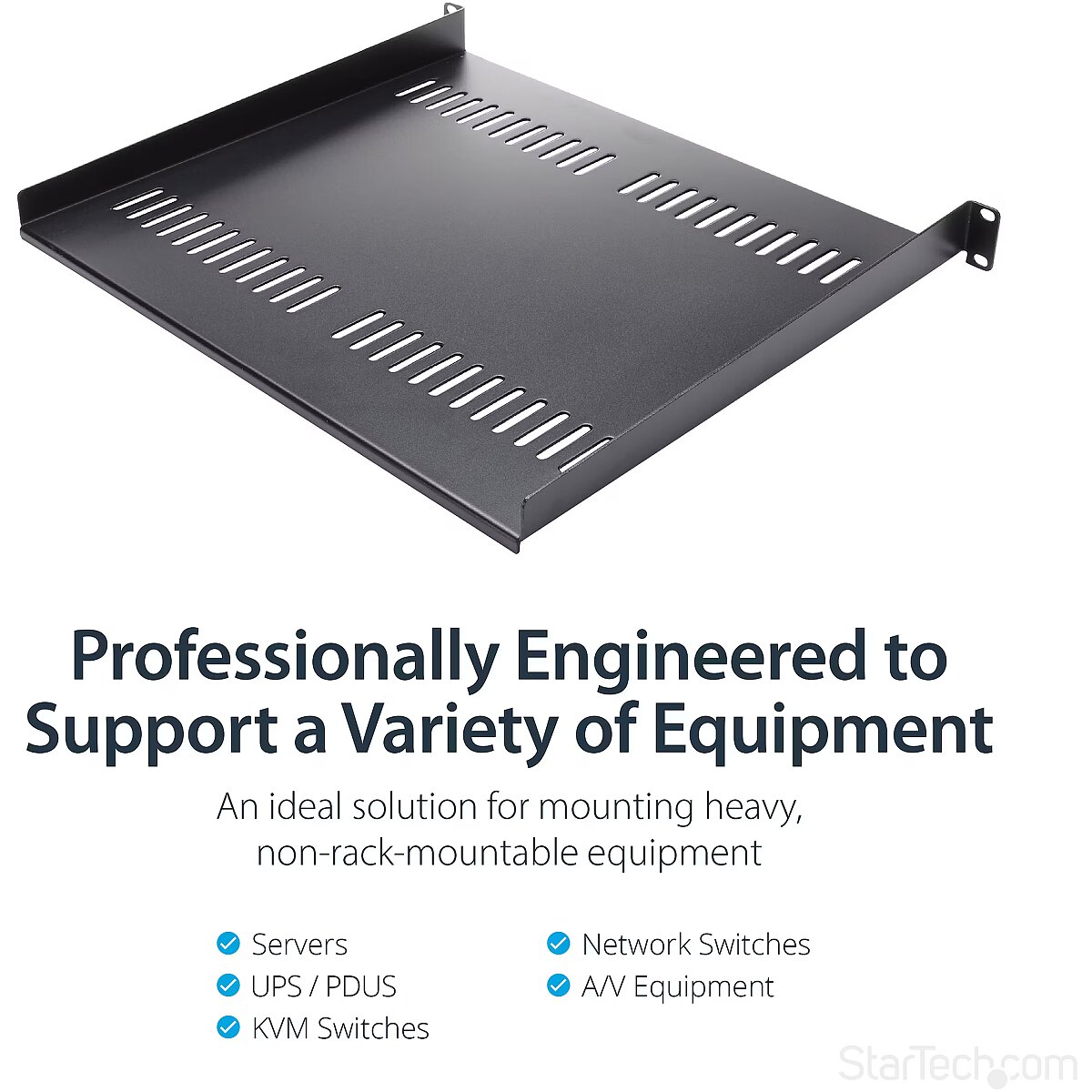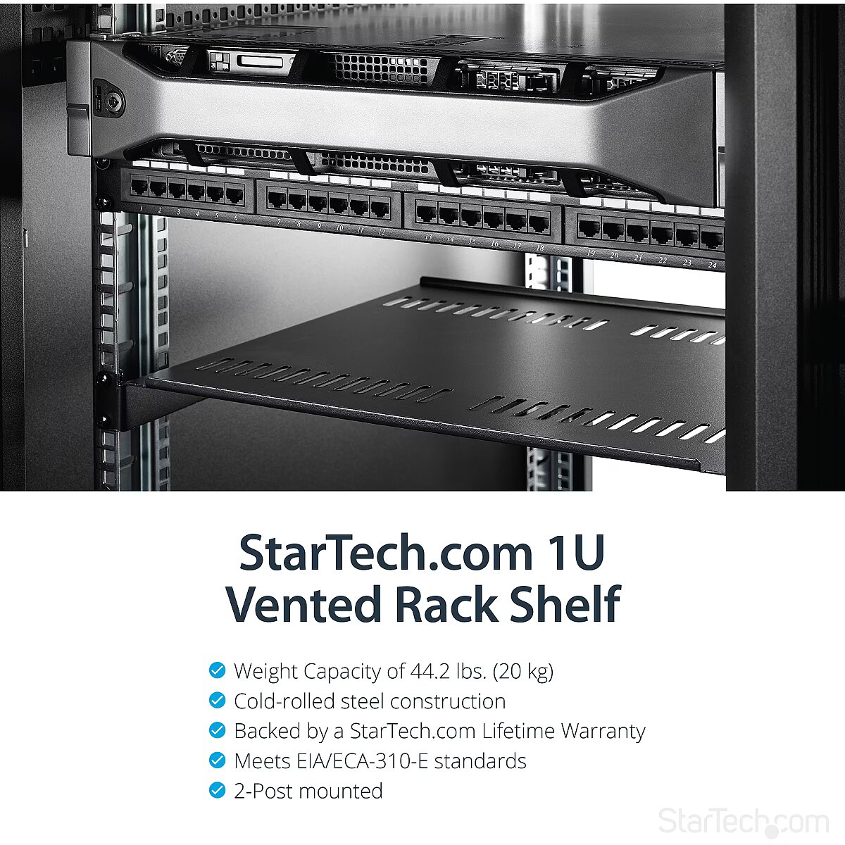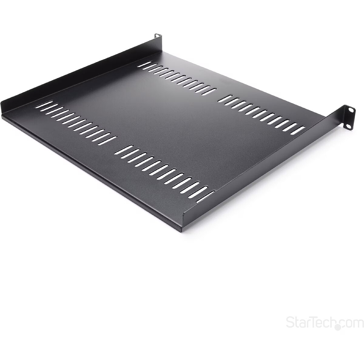 LongDesc - Add a sturdy, 1U server rack shelf into almost any rack or cabinetThis 1U rack shelf lets you add 16 in. of flat storage space to any EIA-310 compliant server rack or cabinet. The shelf is vented to improve air flow and help lower temperatures in your rack.Ensure your equipment is secureThe durable fixed-rack shelf can hold up to 20 kg (44 lbs.) of equipment and is constructed using SPCC commercial-grade cold-rolled steel.Make the most of your available spaceThe 1U cantilever shelf lets you optimize your working space by giving you the ability to mount equipment to your rack instead of taking up desk or floor space. It's perfect for your SOHO (small office, home office) environment, server room or any other location with limited space available.Customize your setupYou can install the 1U vented rack shelf in your rack at any height, giving you a stable surface for placing equipment that's un-mountable or storing your tools.The StarTech.com Advantage