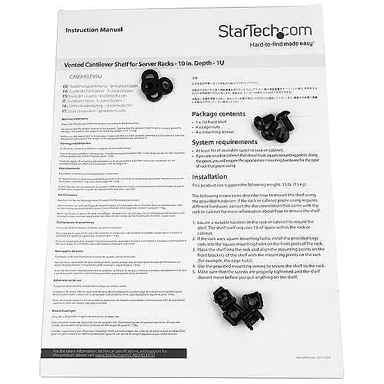 LongDesc - Add a sturdy, 1U server rack shelf into almost any rack or cabinetThis 1U rack shelf lets you add 10 in. of flat storage space to any EIA-310 compliant server rack or cabinet. The shelf is vented to improve air flow and help lower temperatures in your rack.Ensure your equipment is secureThe durable fixed-rack shelf can hold up to 20 kg (44 lbs.) of equipment and is constructed using SPCC commercial-grade cold-rolled steel.Make the most of your available spaceThe 1U cantilever shelf lets you optimize your working space by giving you the ability to mount equipment to your rack instead of taking up desk or floor space. It’s perfect for your SOHO (small office, home office) environment, server room or any other location with limited space available.Customize your setupYou can install the 1U vented rack shelf in your rack at any height, giving you a stable surface for placing equipment that's un-mountable or storing your tools.The CABSHELFV1U is backed by a StarTech.com lifetime warranty and free lifetime technical support.The StarTech.com Advantage