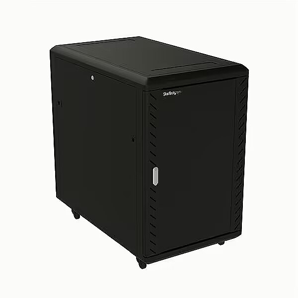 ShortSummaryDescription - StarTech.com 4-Post 18U Server Rack Cabinet, Lockable 19" Data Rack Cabinet for Computer / AV / IT Equipment, Office / Home Network Rack with Casters & Adjustable Mounting Rails, Freestanding rack, 18U, 800 kg, Key lock, 53.1 kg, Black