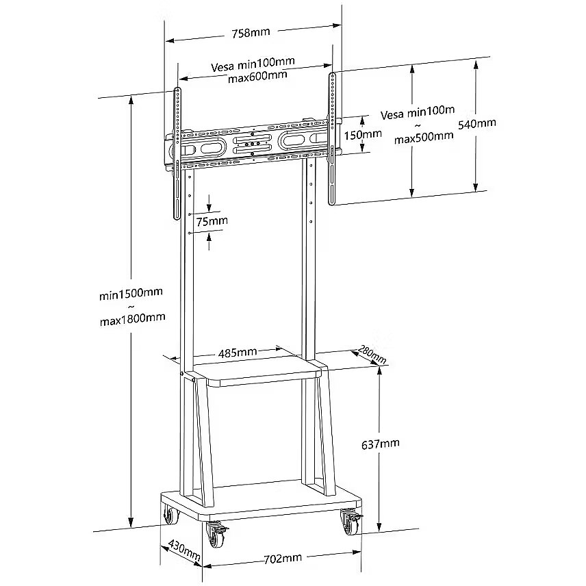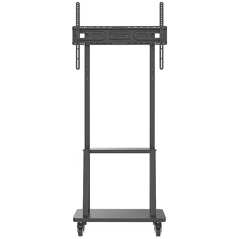 Description - Floor stand for mounting LCD/Plasma screens with a diagonal of 32-70". VESA support: maximum 600x400; maximum load: 70 kg. TV stand on a rectangular base with wheels (702x430 mm), two of which are equipped with brakes for greater stability. TV mount adjustable in 2 positions; total height of the trolley: 1800 mm. Integrated equipment shelf (485x280 mm); trolley color: black.