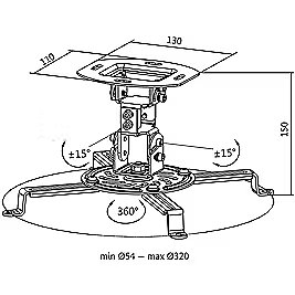 Other features - Suitable for flat or sloping ceilings Suitable for projectors with a pitch circle diameter of 54320 mm Ceiling distance: Projector ceiling 150 mm Rotation: 360°, pitch & roll: +15/-15° Solid ball joint construction allows 360° rotation and 20° tilt for multiple viewing angles Cable management: Elegantly hides all cables connected to the projector Mounting accessories included