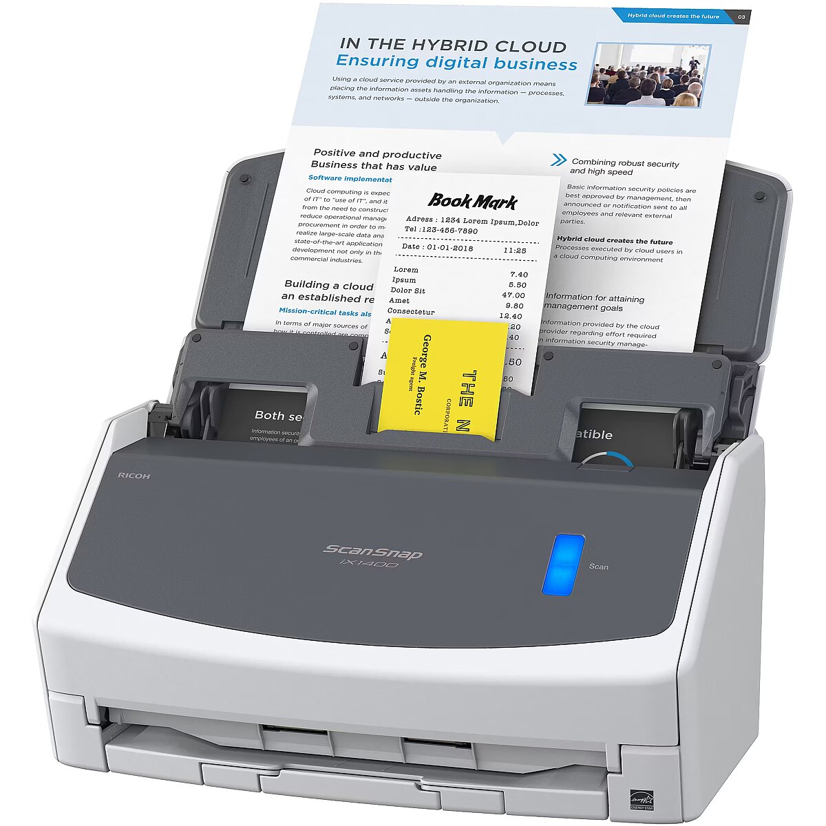 LongSummaryDescription - Ricoh ScanSnap iX1400. Maximum scan size: 216 x 360 mm, Optical scanning resolution: 600 x 600 DPI, ADF scan speed (b/w, A4): 40 ppm. Scanner type: ADF scanner, Product colour: White. Sensor type: Colour CIS, Light source: RGB LED, Scan file formats: JPG, PDF. Standard input capacity: 50 sheets. Maximum ISO A-series paper size: A4, Scanning media types supported: Business Card, Post Card(JPN), ISO A-series sizes (A0...A9): A4, A5, A6