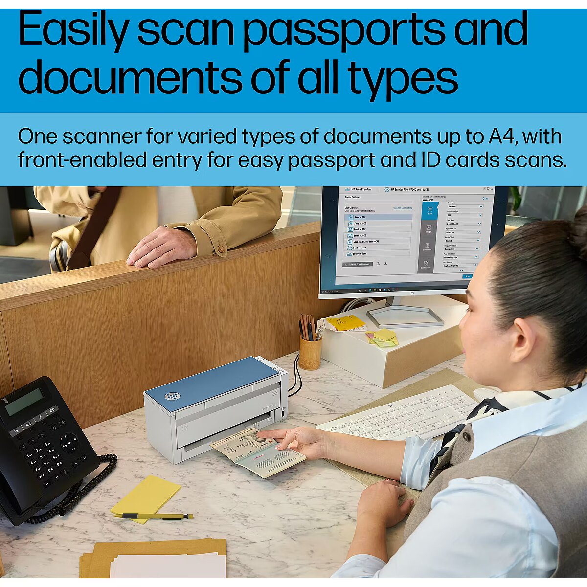 LongDesc - Compact. Versatile. Pro performance. Stay ahead of the demands of your business using the HP ScanJet Pro 4200 s1. Zip through front-desk paperwork with workflow automation and scan a variety of documents from passports to invoices with exceptional clarity—all in a compact design.