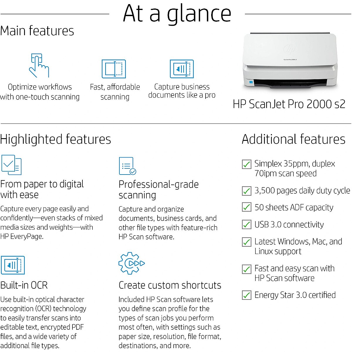 ShortSummaryDescription - HP Scanjet Pro 2000 s2 Sheet-feed Scanner, 216 x 3100 mm, 600 x 600 DPI, 3500 pages, Sheet-fed scanner, Black, White, CMOS CIS