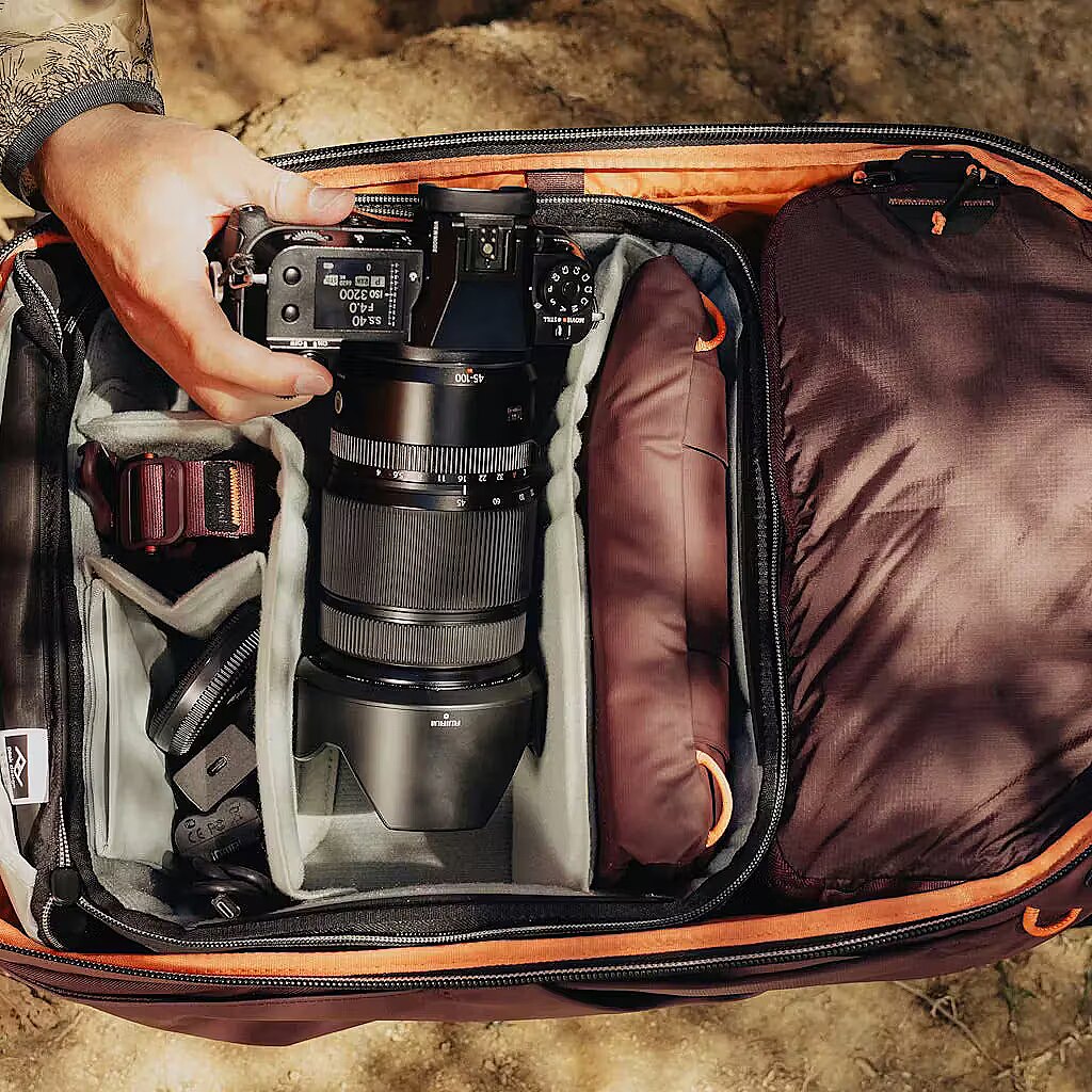 Approved for international carry-on, the bag includes a luggage pass-through for roller bag carry and a protected luggage tag holder. It is equipped with theft-deterrent zipper pulls and designed to fit Peak Design Packing and Camera Cubes (fit 3 units with space for more). Comfort & carrying options
