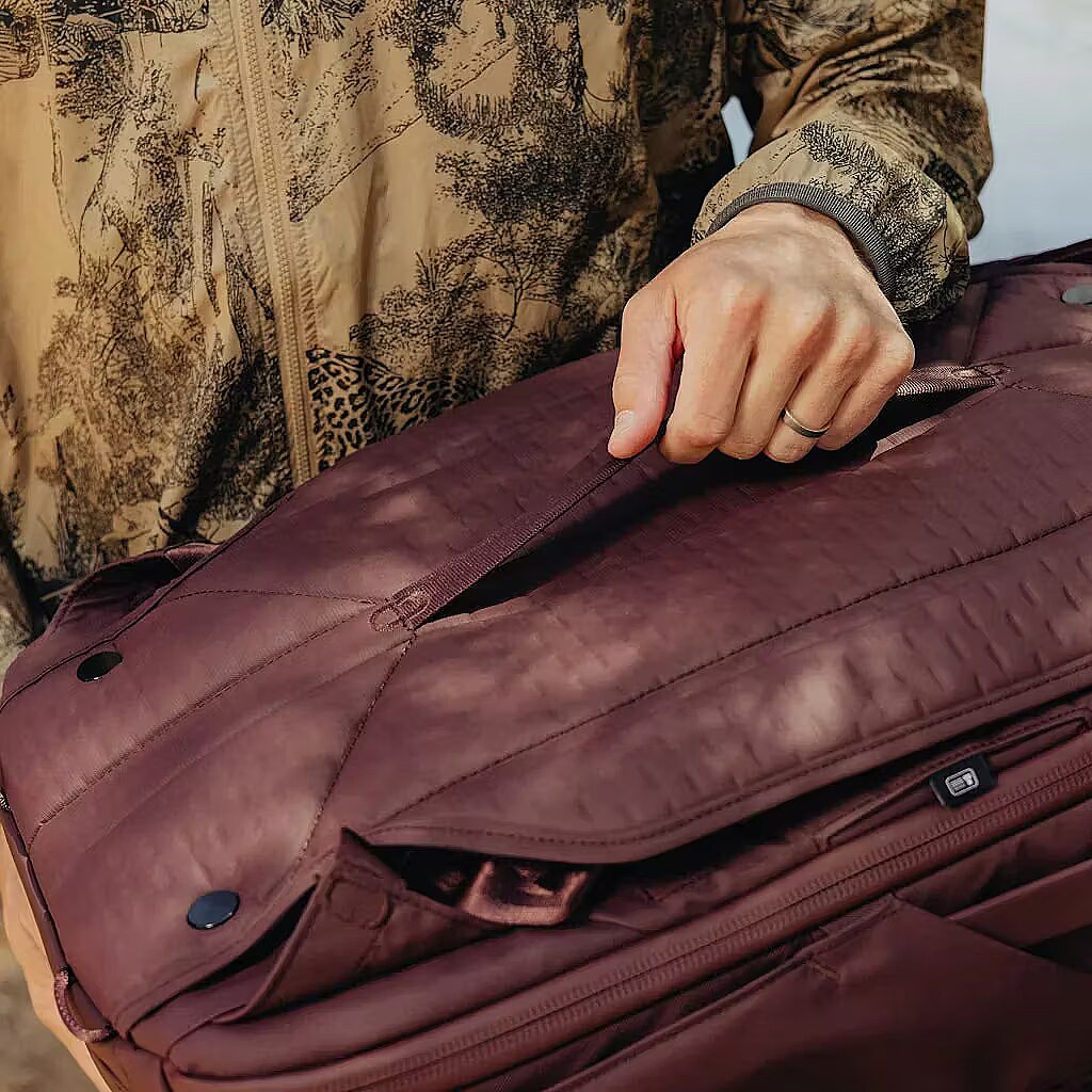Padded shoulder and waist straps stow under magnetic flaps for worry-free bag-checking, with axial strap attachments providing all-day comfort for all body types. The bag also includes a stowable sternum strap and 360-degree grab handles for versatile carrying options. Material & durability