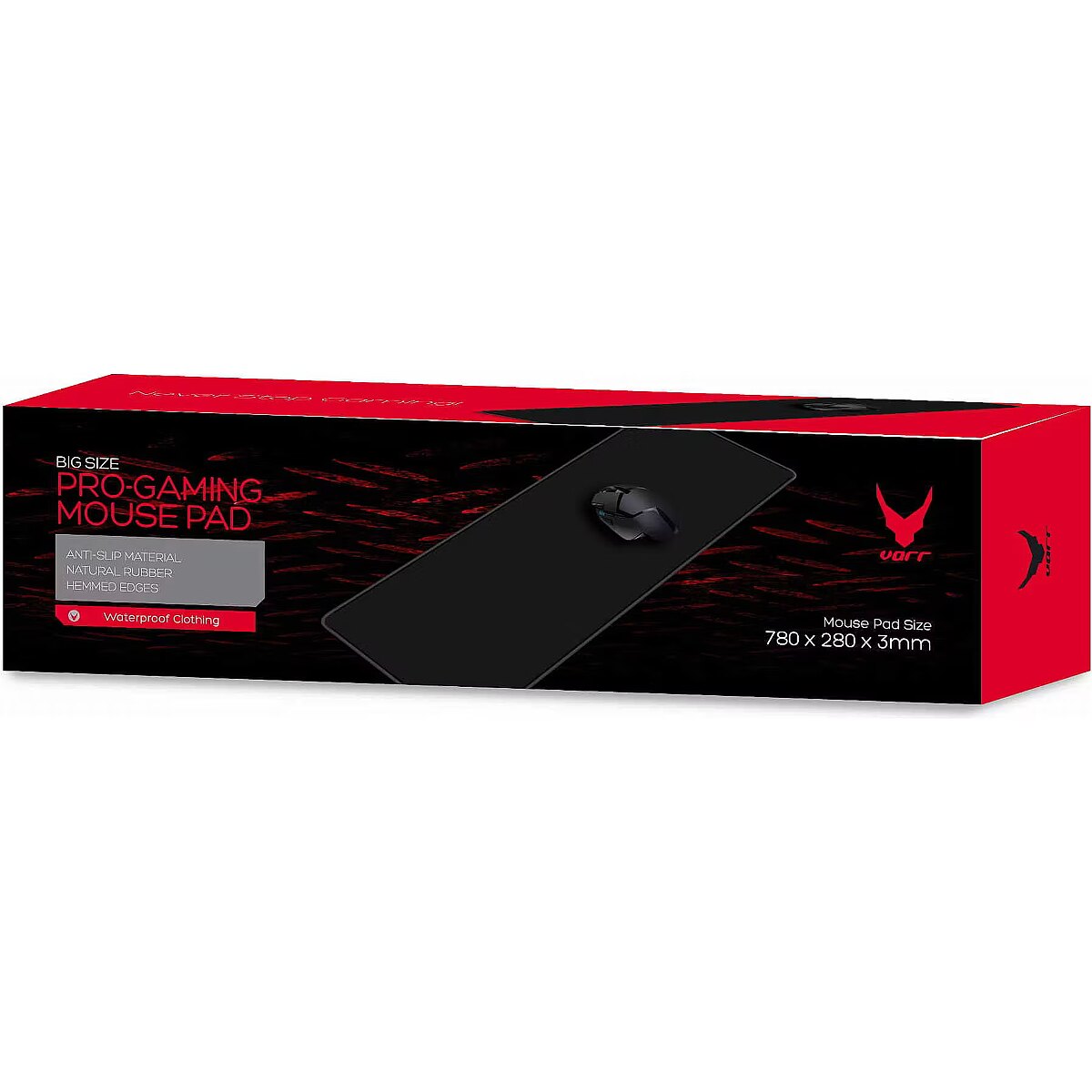 LongSummaryDescription - Varr Gaming Mousepad Mat, Size 780x280x3mm, Non Slip Natural Rubber Material, Water Proof, Rugged Look, Black. Width: 780 mm, Depth: 280 mm. Product colour: Black, Surface coloration: Monochromatic, Material: Rubber, Textile, Anti-wrap edges, Non-slip base, Gaming mouse pad