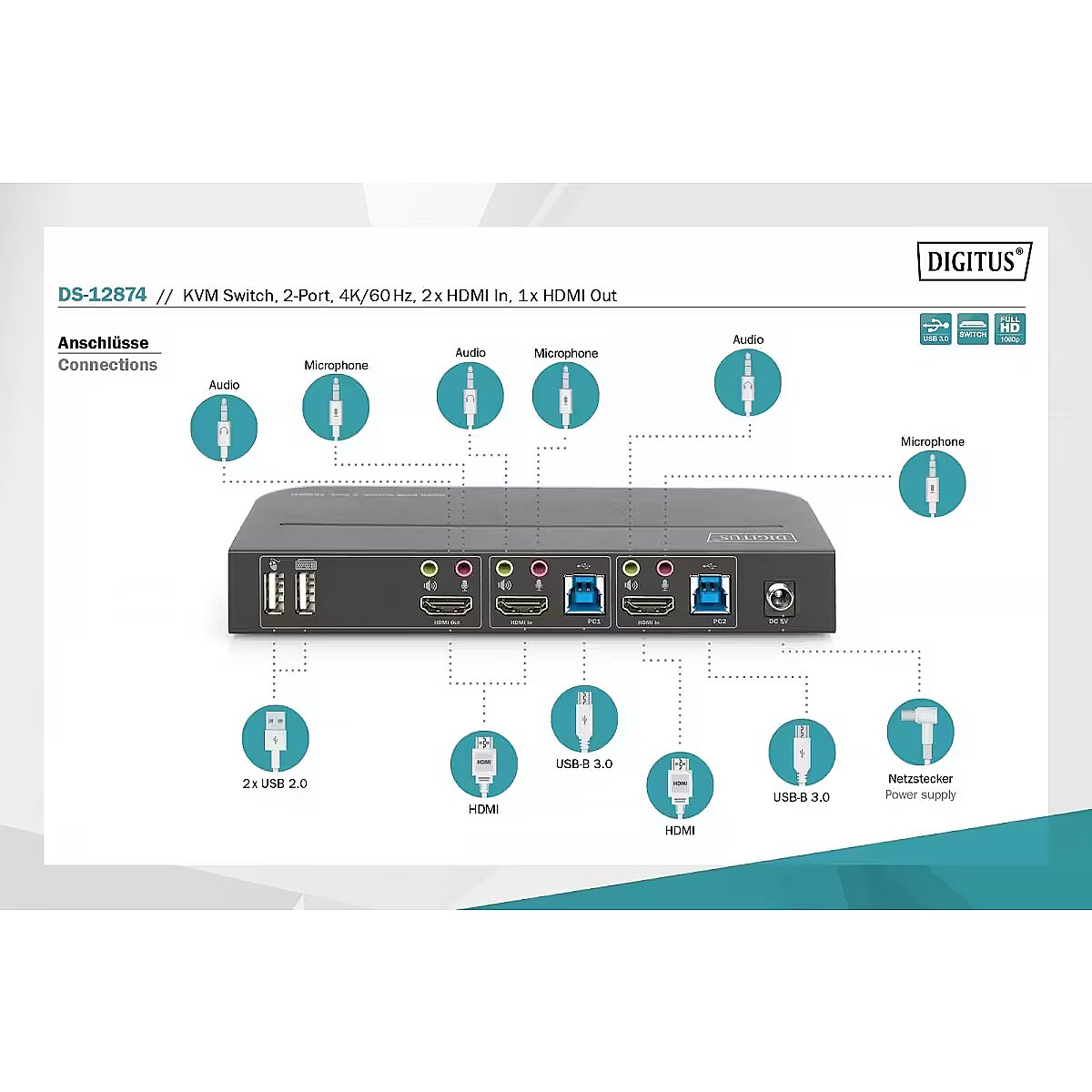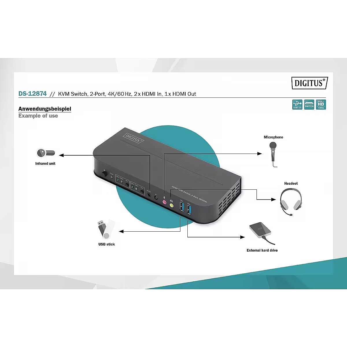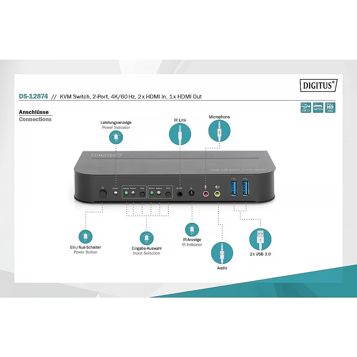 Description - Obsługa 2 komputerów za pomocą klawiatury i myszy USB - przełączanie między dwoma komputerami za naciśnięciem przycisku lub pilotem zdalnego sterowania. 2-portowy KVM DIGITUS to przełącznik KVM HDMI o wysokiej wydajności. Pozwala przesyłać sygnał wideo wysokiej rozdzielczości (w wielu rozdzielczościach do 4Kx2K przy 60 Hz) oraz audio z dowolnego źródła do urządzeń wyświetlających. Przełącznik HDMI KVM dysponuje nie tylko funkcją przełączania jednym przyciskiem, ale także trybem inteligentnym oraz funkcją podłączania podczas pracy (hot plugging). Można używać jednego monitora, myszy i klawiatury do obsługi dwóch komputerów Przyłącza USB klawiatury i myszy Złącza audio do mikrofonu/głośnika Zintegrowany koncentrator USB z 2 portami USB 3.0 do podłączenia dodatkowych urządzeń peryferyjnych Przełączanie między komputerami PC za pomocą przełącznika KVM, pilota zdalnego sterowania lub klawisza skrótu na klawiaturze Obsługa: HDMI 2.0 / HDCP 2.2 / HDR / FreeSync / 3D / Kontrolki LED z przodu wskazujące status i funkcje Możliwy montaż na ścianie Plug and Play - instalacja sterownika nie jest konieczna Obsługa funkcji zdalnego sterowania na podczerwień Obsługa Windows /Linux/Apple Mac OS