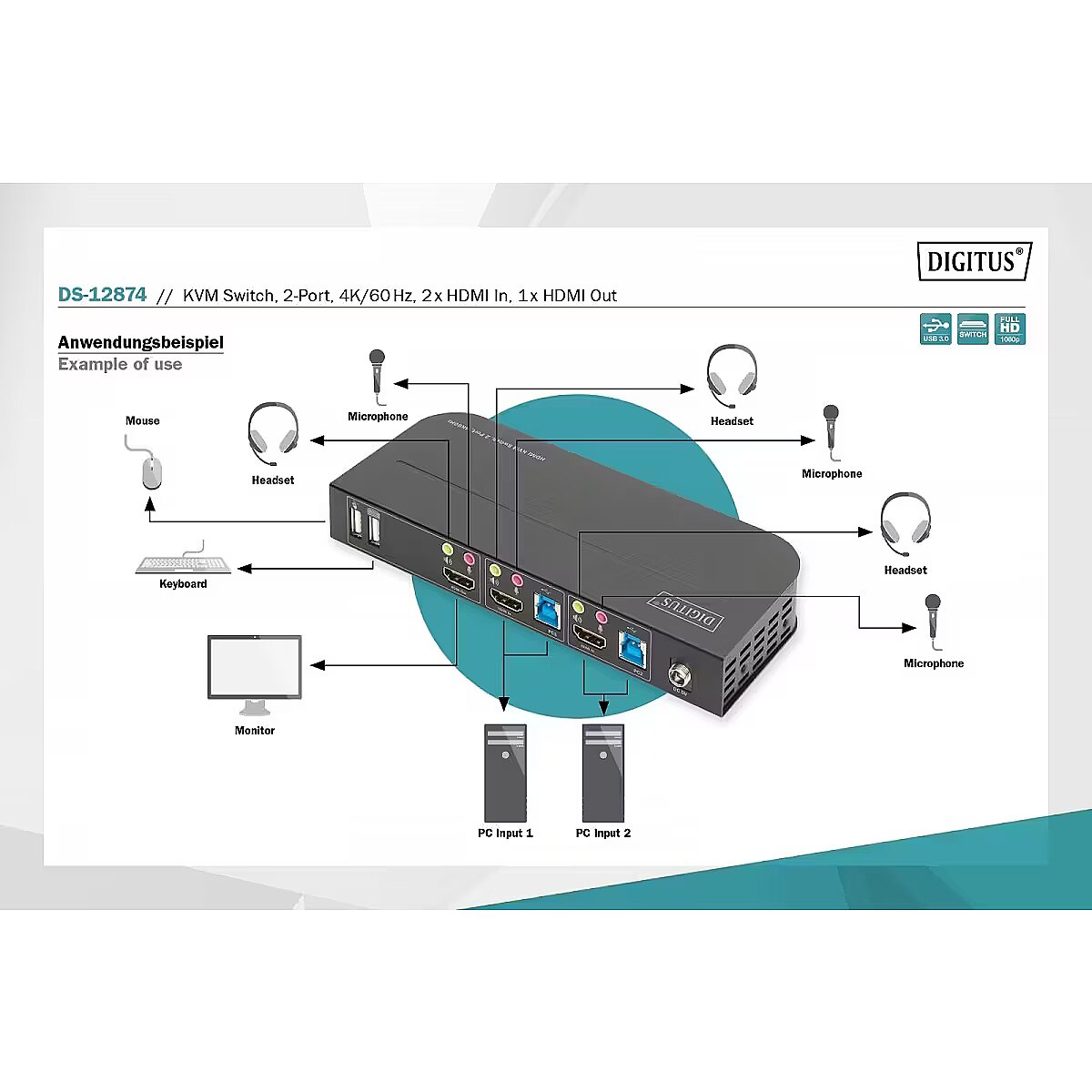 Digitus KVM Switch 2x1 HDMI HDMI Out USB 4Kx2K 60Hz