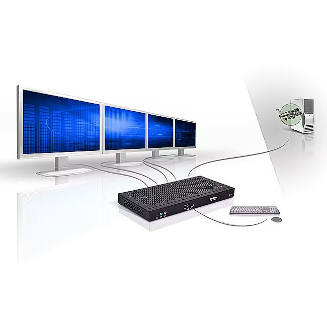 LongDesc - Best-in-Class Quad KVM Optical ExtenderThe Matrox Extio F2408 point-to-point, KVM extension solution separates the keyboard, mouse, audio peripherals and up to 4 displays from the rest of the computer by up to 1 km (3280 feet) via fiber-optic cable. The fiber-optic connection allows raw, uncompressed data to travel between the remote host system and the user-side Extio F2408 appliance, resulting in unmatched HD resolution support and uncompromised workstation performance. Designed for industries requiring stable, reliable, and scalable graphics, the Extio F2408 also allows room for expansion. Combine it with the optional Extio F2408E Expander to drive even more mission critical displays – up to 8 in all, with a maximum resolution of 2560x1600 per display and this all from a single workstation, fiber-optic cable, and adapter.