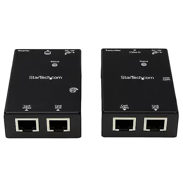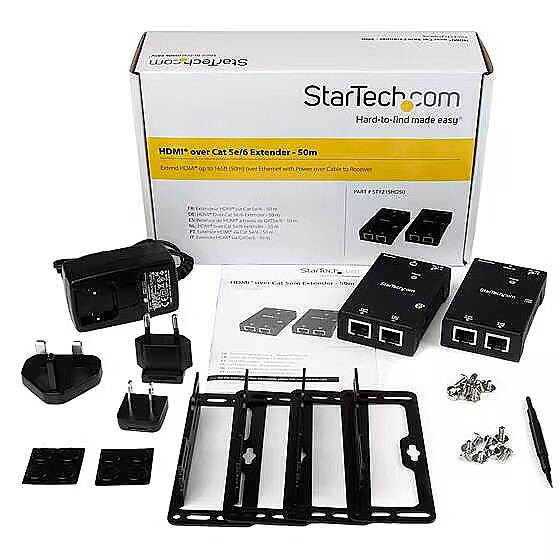 LongDesc - Extend HDMI® up to 165ft (50m) over Cat5e/6 cabling with Power over Cable to ReceiverThe ST121SHD50 HDMI® over Cat5e/Cat6 Video Extender kit lets you extend HDMI video and audio by up to 165 feet (50 Meters) over dual Cat5e cables or dual Cat6 cables. For added versatility the kit features Power Over Cable and only requires a single power adapter that can be connected to either the Transmitter or Receiver.With support for High-Definition resolutions of up to 1920x1080 / 1080p and the accompanying digital audio, this cost-effective HD extender can easily be installed using new or existing Ethernet infrastructure wiring. For a convenient plug-and-play installation, the HDMI extender features built-in EDID monitor emulation, which ensures native resolution and maximum compatibility with your display or projector.For added flexibility and convenience, HDMI cables up to 32ft (10m) can be connected to both the local and remote units, which lets you extend your HDMI signal to even further distances.The HDMI extender kit offers a point-to-point digital signage solution right out of the box, including both local transmitter and remote receiver units, along with optional hardware that lets you mount the units as needed. Plus, with Power Over Cable, you can easily extend an HDMI signal in areas where access to power outlets is limited.This product is TAA compliant and backed by a Startech.com 2-year warranty with free lifetime technical support.The StarTech.com Advantage