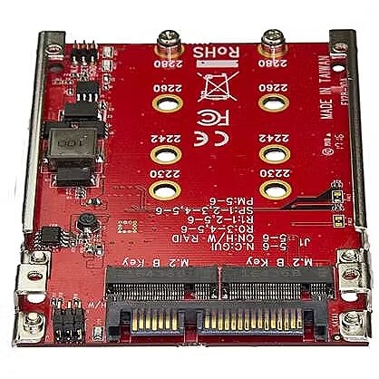 ShortSummaryDescription - StarTech.com Dual-Slot M.2 Drive to SATA Adapter for 2.5" Drive Bay - RAID, SATA, M.2, Red, CE, FCC, REACH, TAA, ASMedia - ASM1092R, 6 Gbit/s