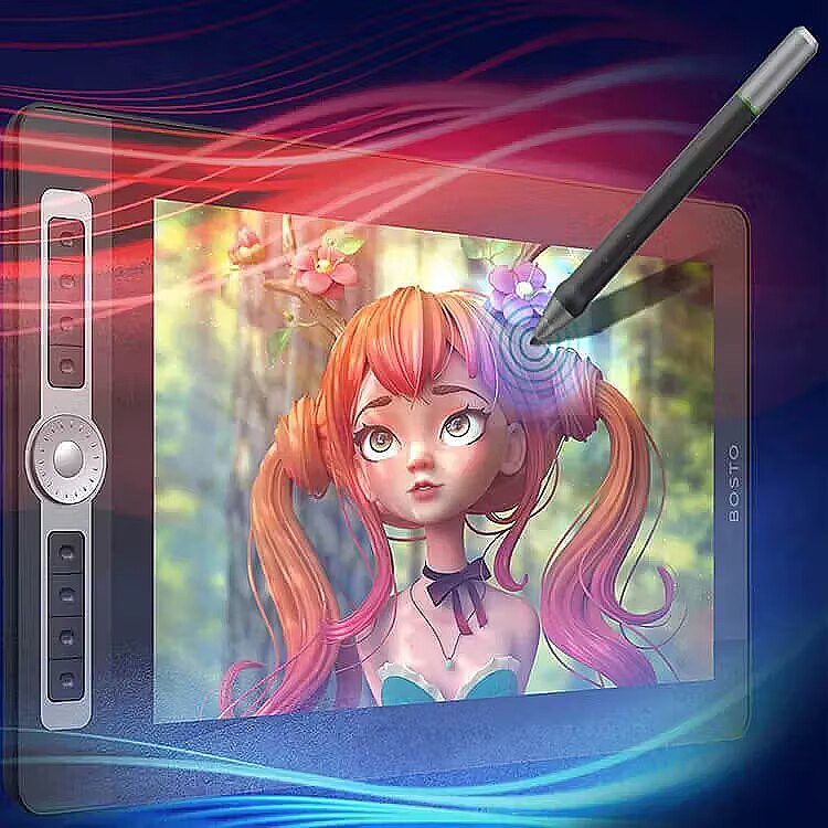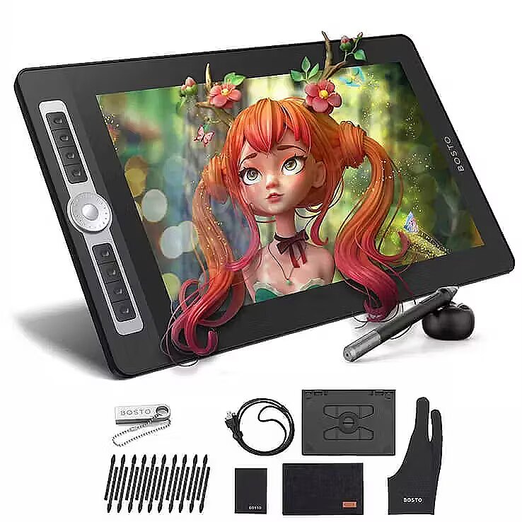 Description - A graphics tablet for everyone It doesn't matter whether you are a graphic designer or are just planning to become one. The BOSTO BT-16HD Pro tablet is a good choice for everyone, regardless of their skill level. The BOSTO BT-16HD Pro graphic tablet is a tablet with an LCD screen. This device is intended for creating digital graphics. It is also useful when studying, taking notes, giving presentations or lectures. As the name suggests, the tablet has a display. The effects of your work are visible at hand on the tablet and computer screen. The tablet needs constant connection to the computer to work. The BOSTO BT-16HD Pro tablet is distinguished by the presence of physical buttons that make performing repetitive tasks even easier. Physical buttons Physical buttons make it easy to access frequently used functions. Huge work surface The screen with a diagonal of 15.6, 16:9 aspect ratio and a working surface of 344.16 mm x 193.59 mm allows for comfortable work. 15.6 is the size of the most frequently purchased laptops. Display with FHD 1920 x 1080 px resolution The detail of the image will allow you to create precise graphics. 1920 x 1080 px is the typical resolution of laptop displays. Millions, 16.7 million to be precise. True, COLORS, but maybe someday? Who knows. The True Color standard and 8-bit color depth prevent banding. This means that the transitions between the displayed colors pass smoothly, without the impression of sharp and unsightly transitions. Gamut, i.e. a color range of 120% sRGB Color space coverage of 120% sRGB ensures very good color reproduction on devices and in software involved in graphics processing (e.g. monitor, printer, tablet, digital camera). Thanks to this, the tablet screen offers excellent color reproduction. Wide viewing angles Viewing angles: 178° (89°/89°) H (horizontal), 178° (89°/89°) V (vertical) allow for reliable reflection of contrast and colors regardless of the viewing angle of the screen. Compatibility The BOSTO BT-16HD Pro graphics tablet is compatible with the most popular Windows and macOS operating systems. With the tablet you can work with graphic software such as: Photoshop, CorelDRAW, GIMP, Krita, Sketchbook, MediBang Paint Pro etc. If your computer does not have a HDMI port, you must purchase an adapter. Ergonomics The anti-slip stand with an adjustable angle of inclination in the range of 0° - 60° ensures better drawing comfort and reduces the pain of the wrist after long hours of work, adapting to current needs. One cable does everything The cable combines USB and HDMI cables in one braid. No more tangled cables on your desk. Fewer tangled cables, more comfortable work. The screen is protected with tempered glass The glass pane protects the sensitive screen from damage, providing additional security. Design pleasing to the eye Minimalist and at the same time aesthetic design. Response to stylus pressure Thanks to 8192 LPS (levels pressure sensitivity), the tablet dynamically responds to pen pressure. This changes the thickness of the brush. Stronger pressure, thicker line. This, combined with 5080 LPI (lines per inch) ensures the most natural drawing experience possible, reducing drawing fatigue while ensuring smooth and precise work. Reporting speed Reporting speed > 220 RPS (reports per second) allows the computer to see the position of the pen in a fraction of a second. This allows you to draw lines without delays. Large stylus tilt range The screen responds to the stylus at an angle of up to 60°. Thanks to this, the pen can be adjusted according to your habits for more comfortable work. BOSTO W09 fountain pen Wireless, battery-free, passive Pen resolution: 5080 LPI (0.005 mm/point) Pressure Levels: 8192 LPS Reporting speed: > 220 RPS (reports/sec) Precision: 0.25 mm Detection height: 15 mm