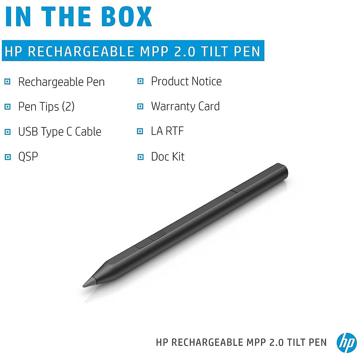 Accessories included - HP Rechargeable MPP2.0 Tilt Pen 2 extra stylus tips USB-C cable Quick start guide Product information Warranty card RTF card (LA only)